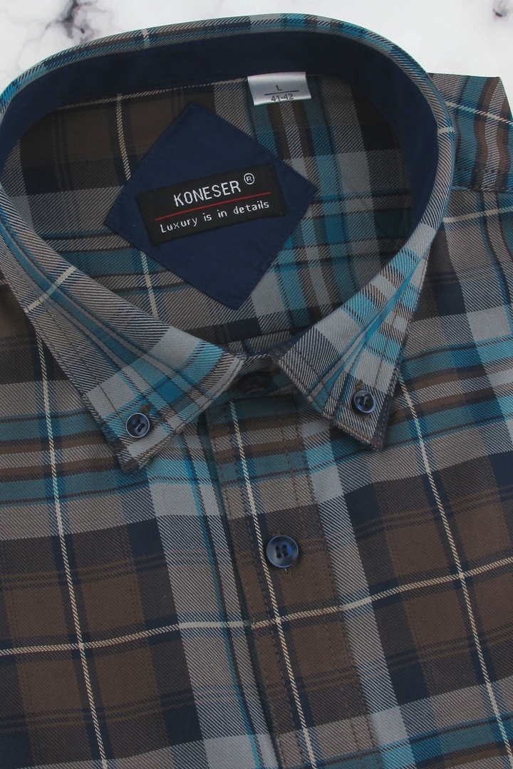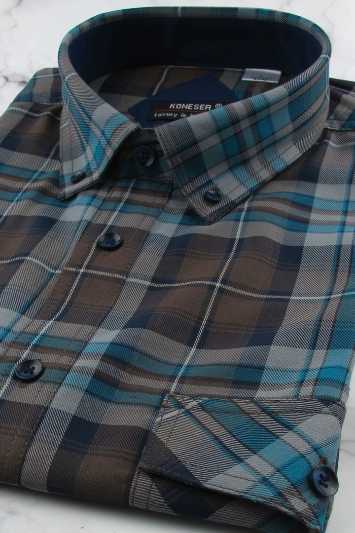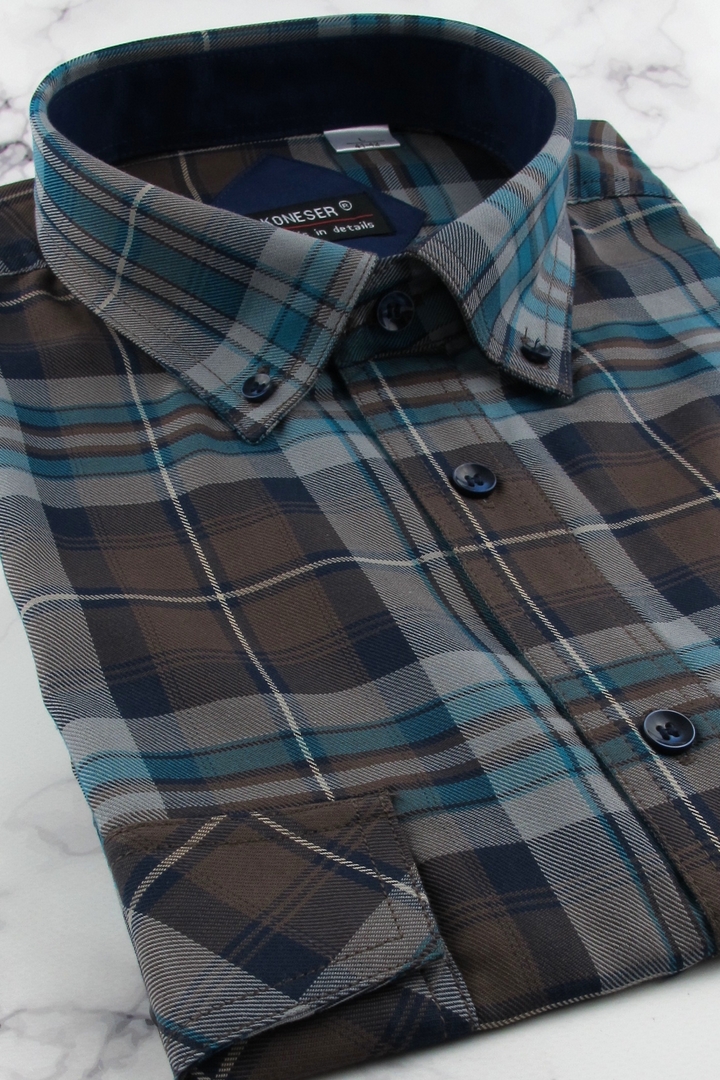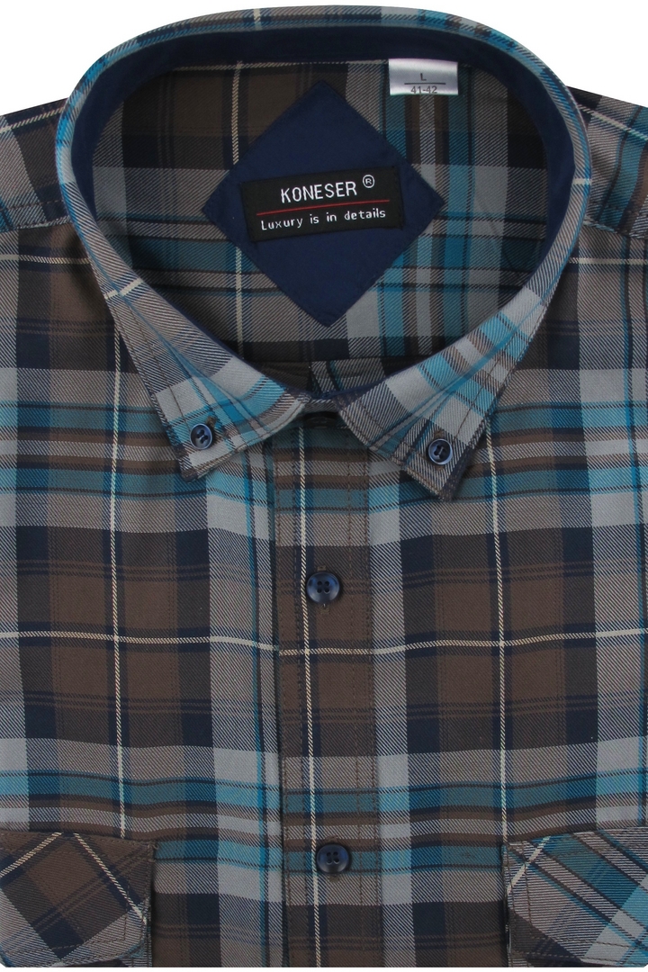 Duża Koszula Męska Codzienna Bawełniana Casual brązowa w kratę z długim rękawem Duże rozmiary Koneser J604