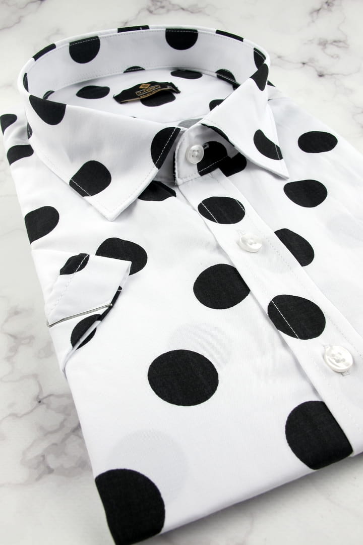Duża Koszula Męska Elegancka Wizytowa do garnituru biała w grochy z krótkim rękawem Duże rozmiary Classo P092