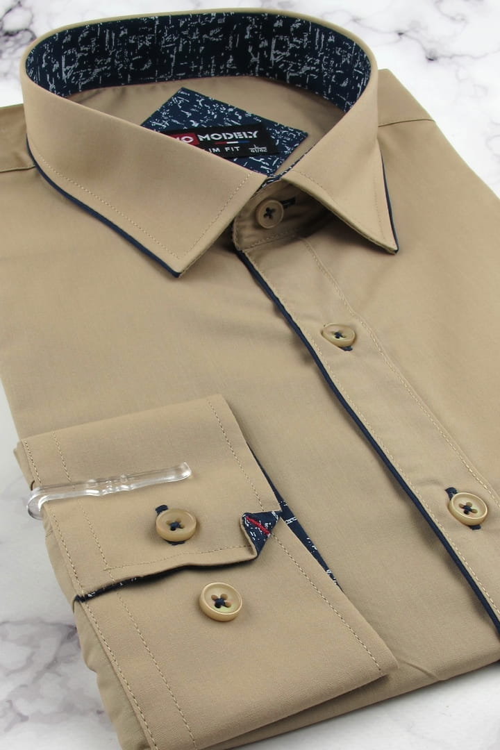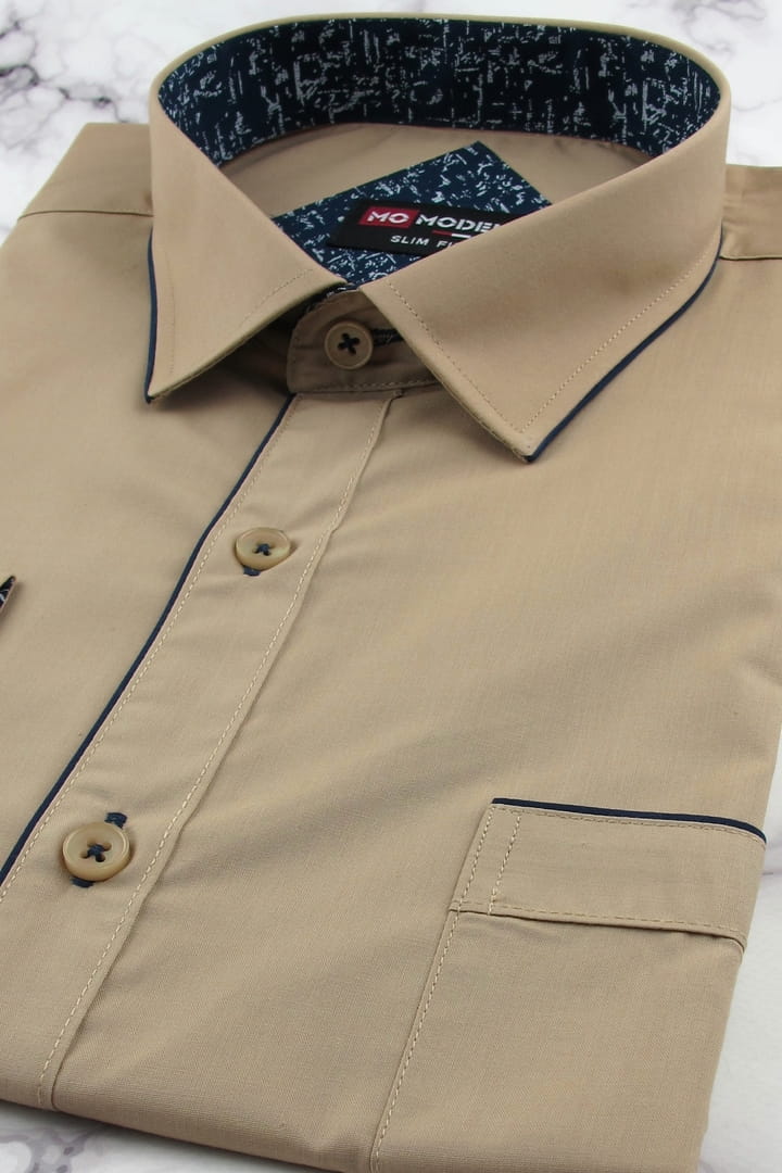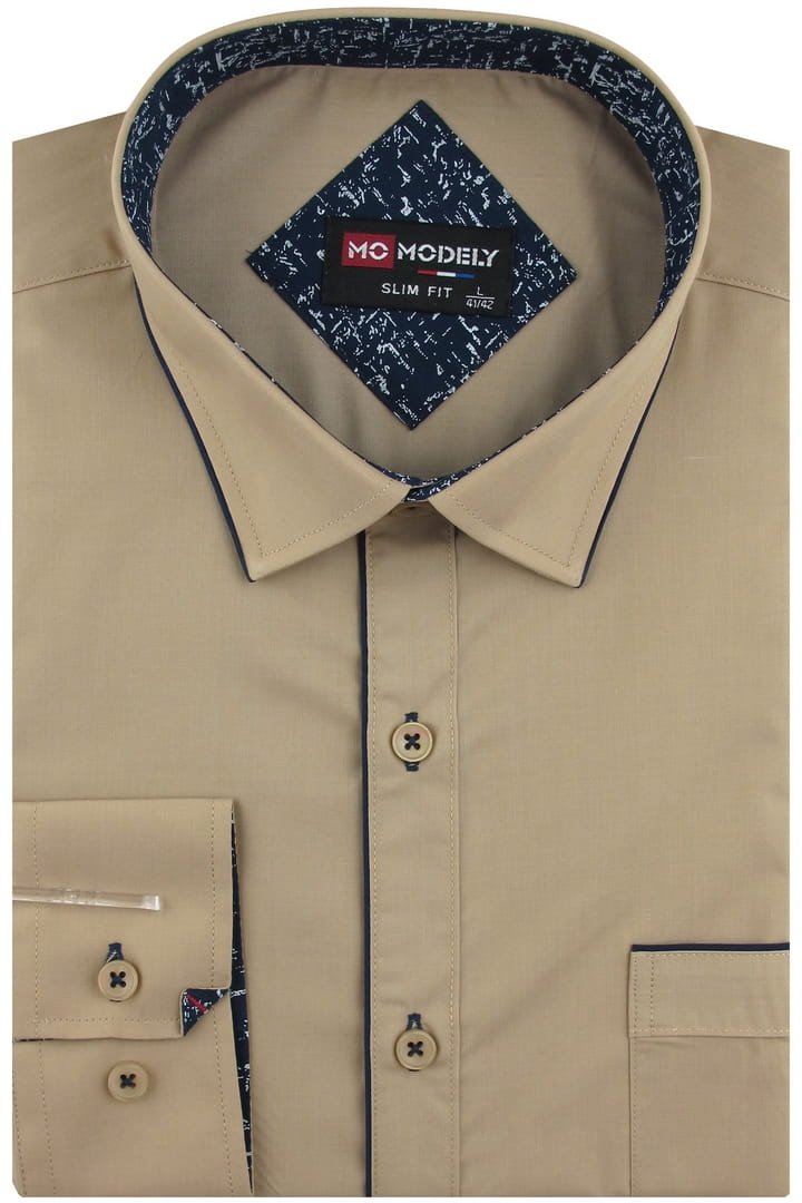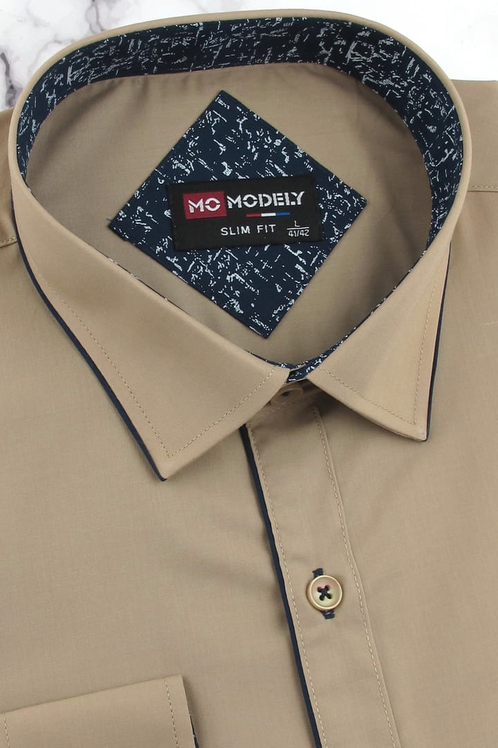 Duża Koszula Męska Elegancka Wizytowa do garnituru gładka karmelowa z lamówką z długim rękawem Duże rozmiary H506