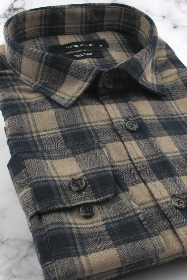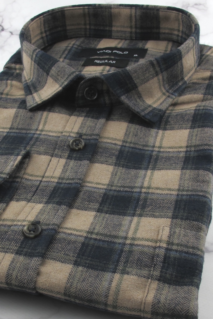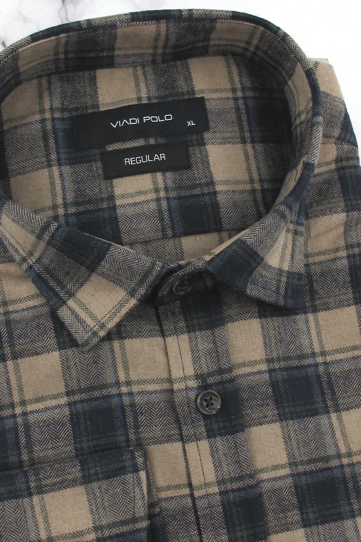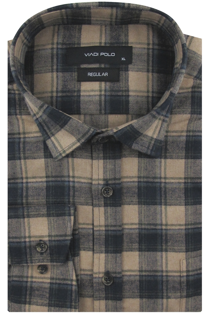 Flanelowa Koszula Męska Codzienna Casual beżowa w kratę z długim rękawem w kroju REGULAR Viadi Polo J631