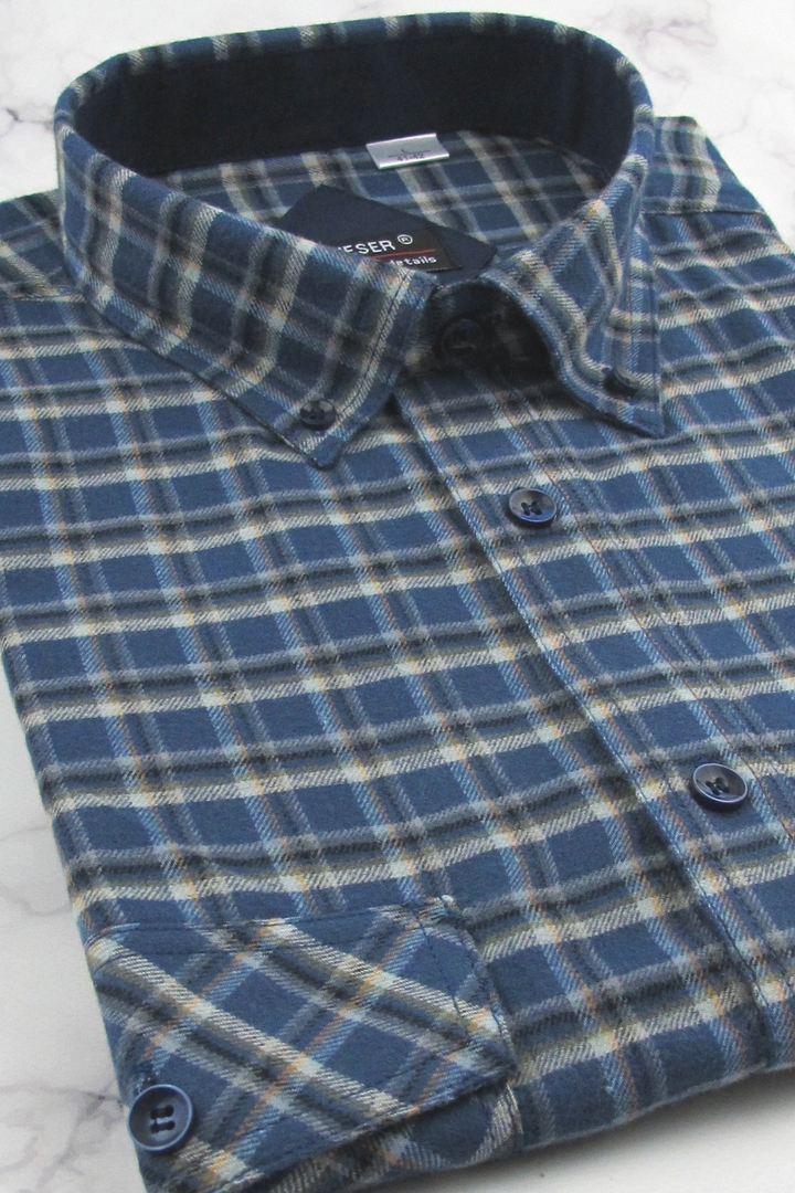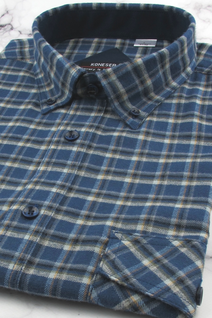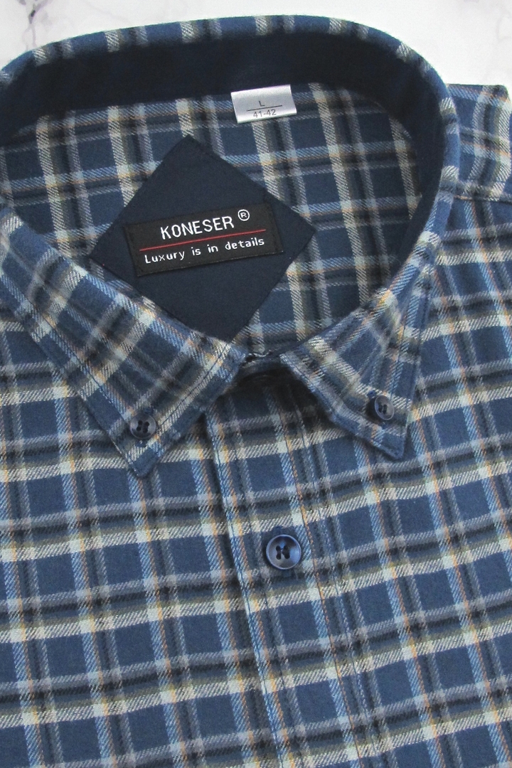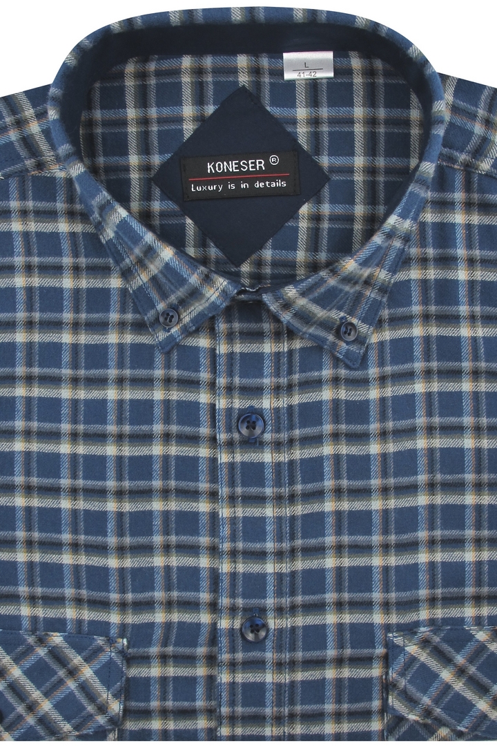 Flanelowa Koszula Męska Codzienna Casual granatowa w kratę z długim rękawem w kroju REGULAR Koneser J818