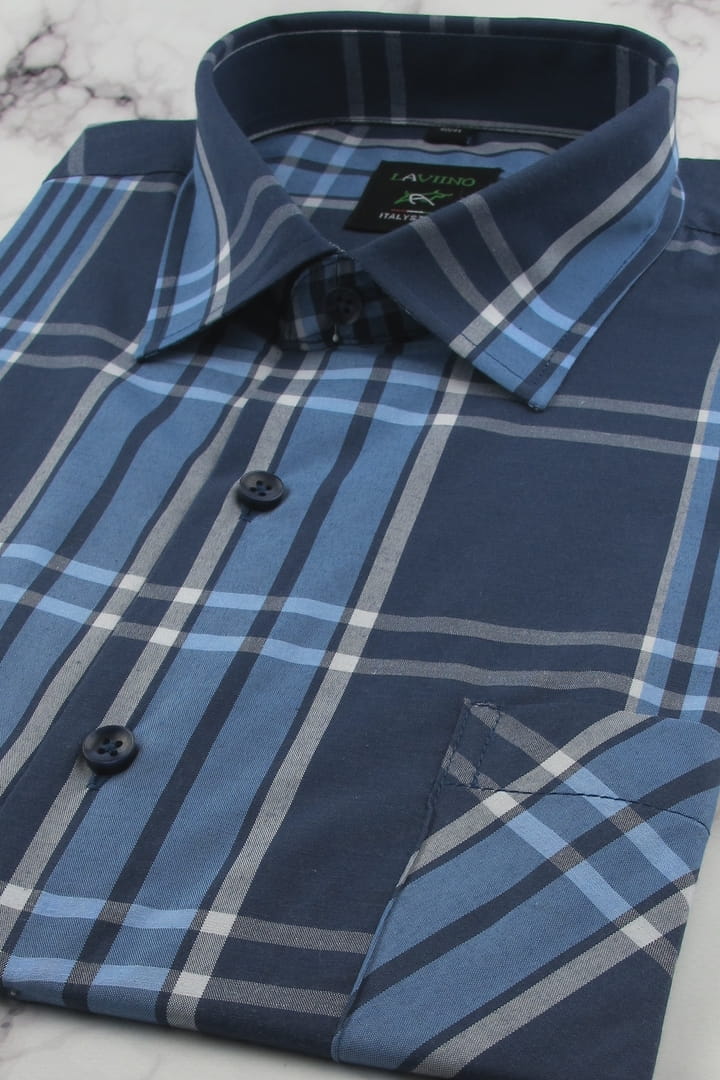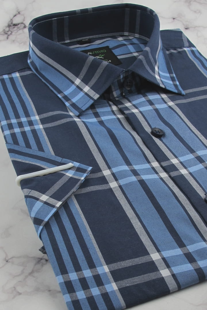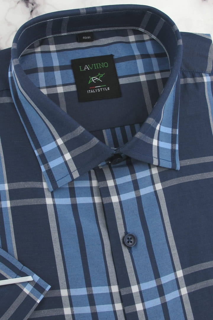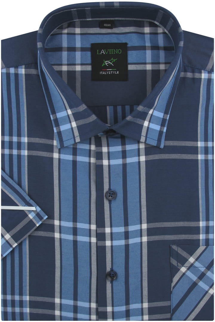 Koszula Męska Codzienna Bawełniana Casual niebieska w kratkę z krótkim rękawem w kroju REGULAR Laviino P582