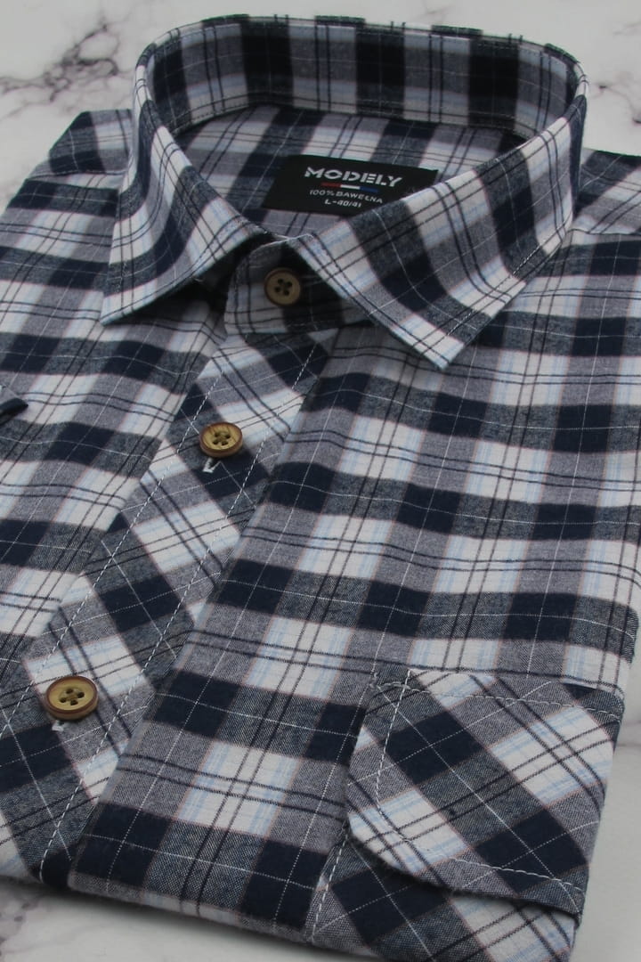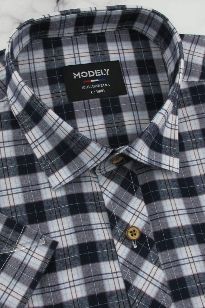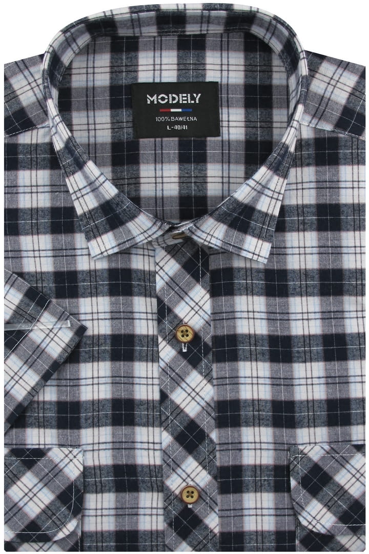 Koszula Męska Codzienna Casual granatowa w kratkę z kieszonkami z klapą z krótkim rękawem w kroju REGULAR Modely P472