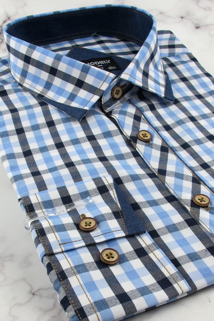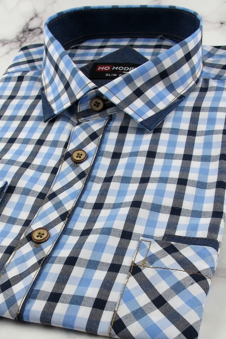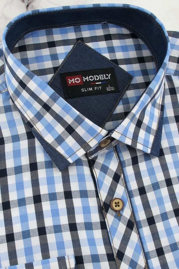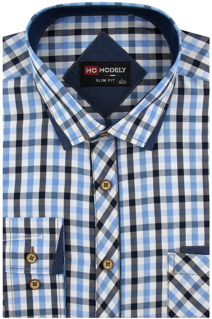 Koszula Męska Codzienna Casual niebieska w kratkę z długim rękawem w kroju SLIM FIT Modely H593