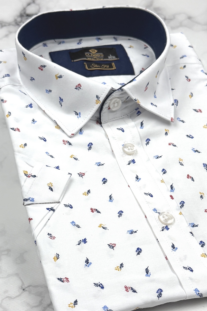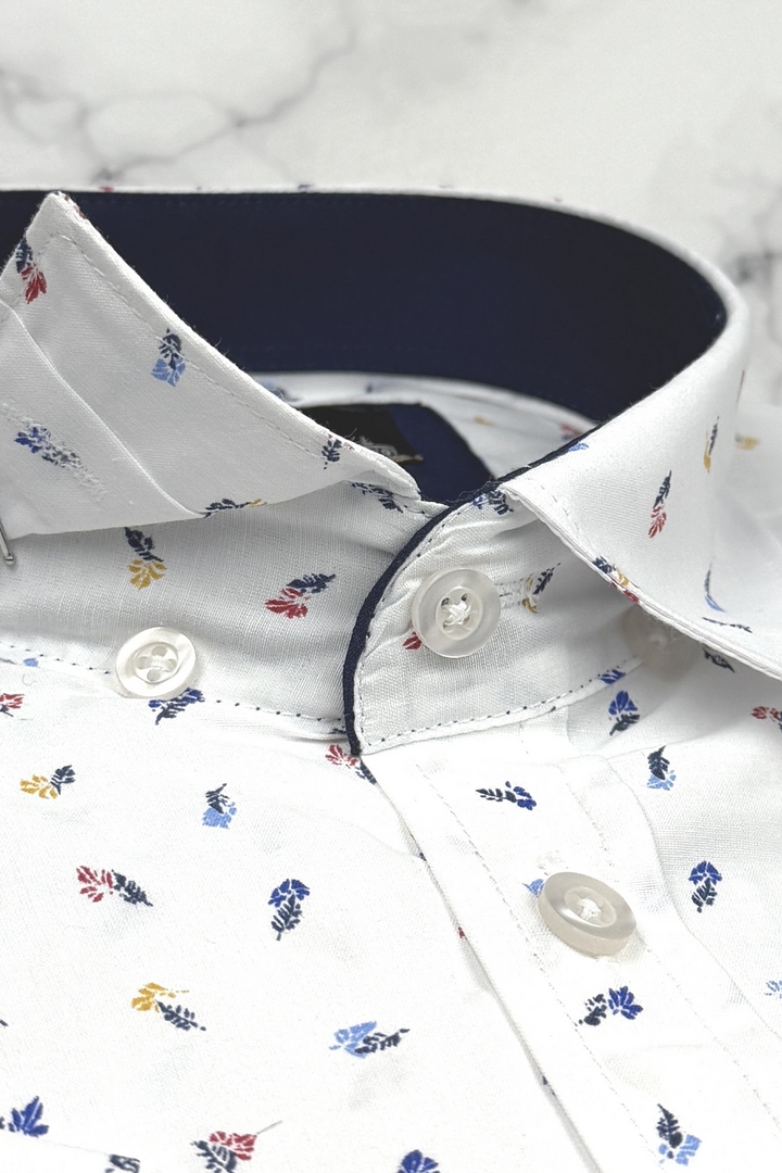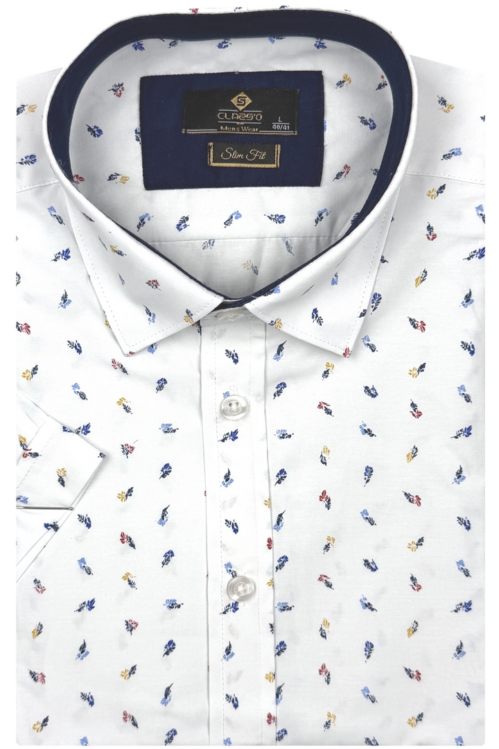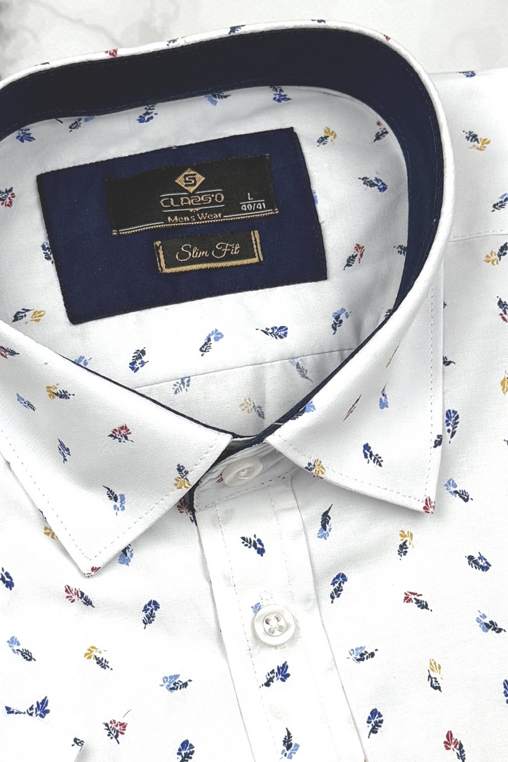 Koszula Męska Elegancka Biała w Listki Slim Fit Classo R428