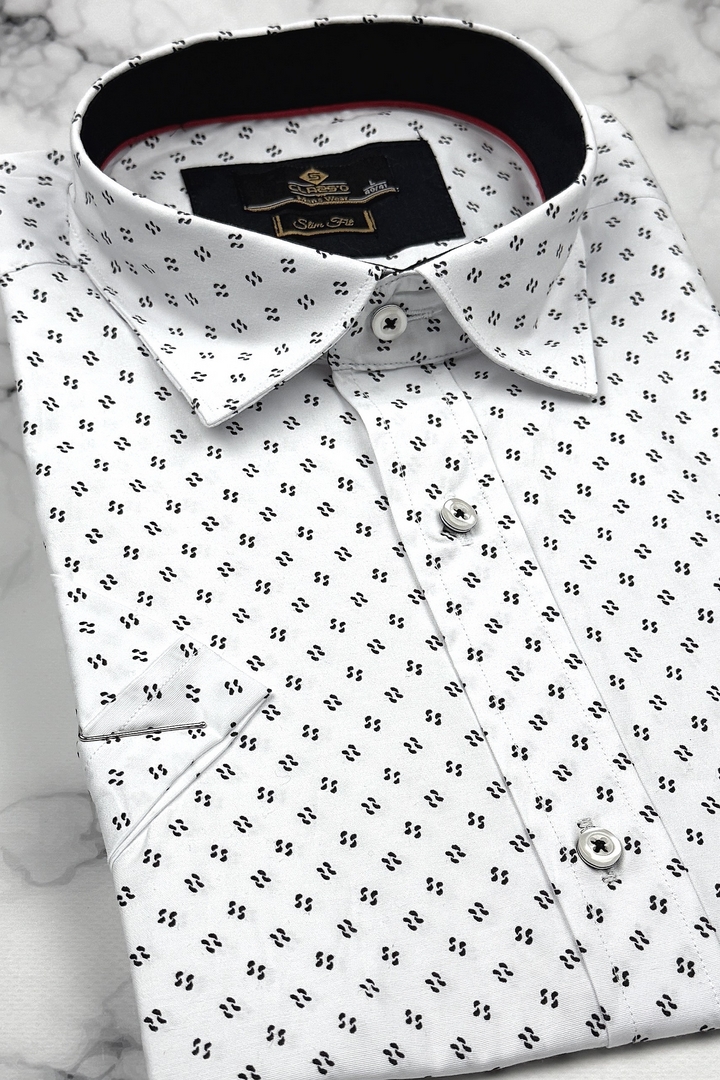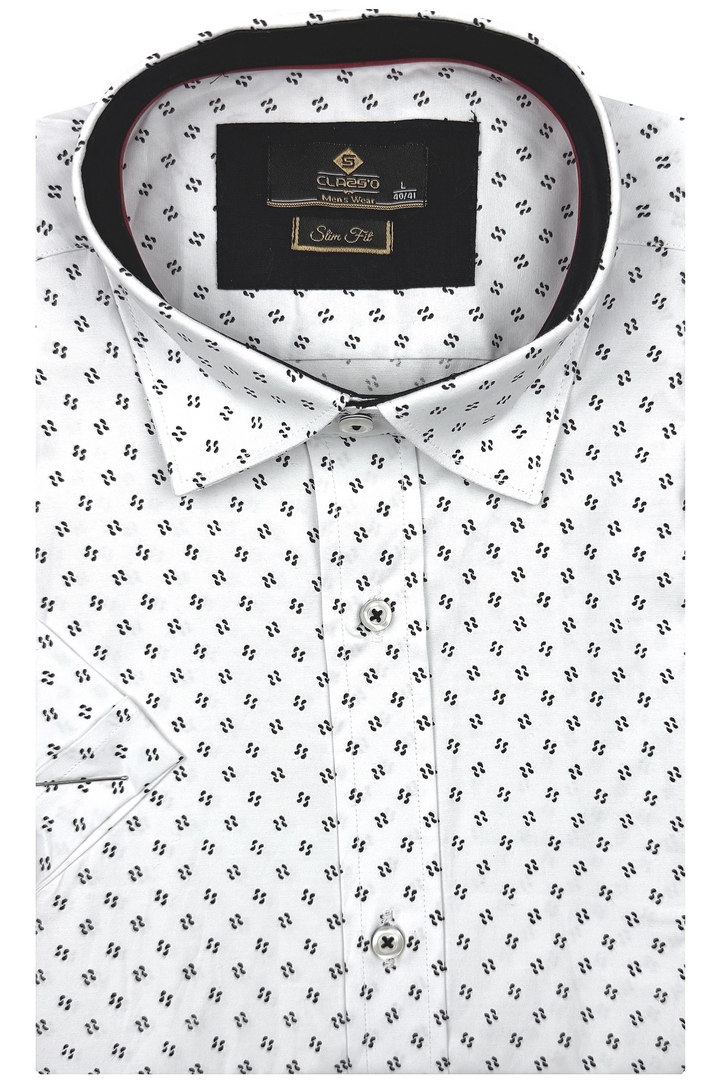 Koszula męska elegancka z krótkim rękawem we wzorki w kroju slim fit doskonale komponuje się z eleganckimi spodniami, chinosami oraz stylowymi jeansami. Można ją nosić zarówno w bardziej formalnych stylizacjach, jak i w wersji smart casual.