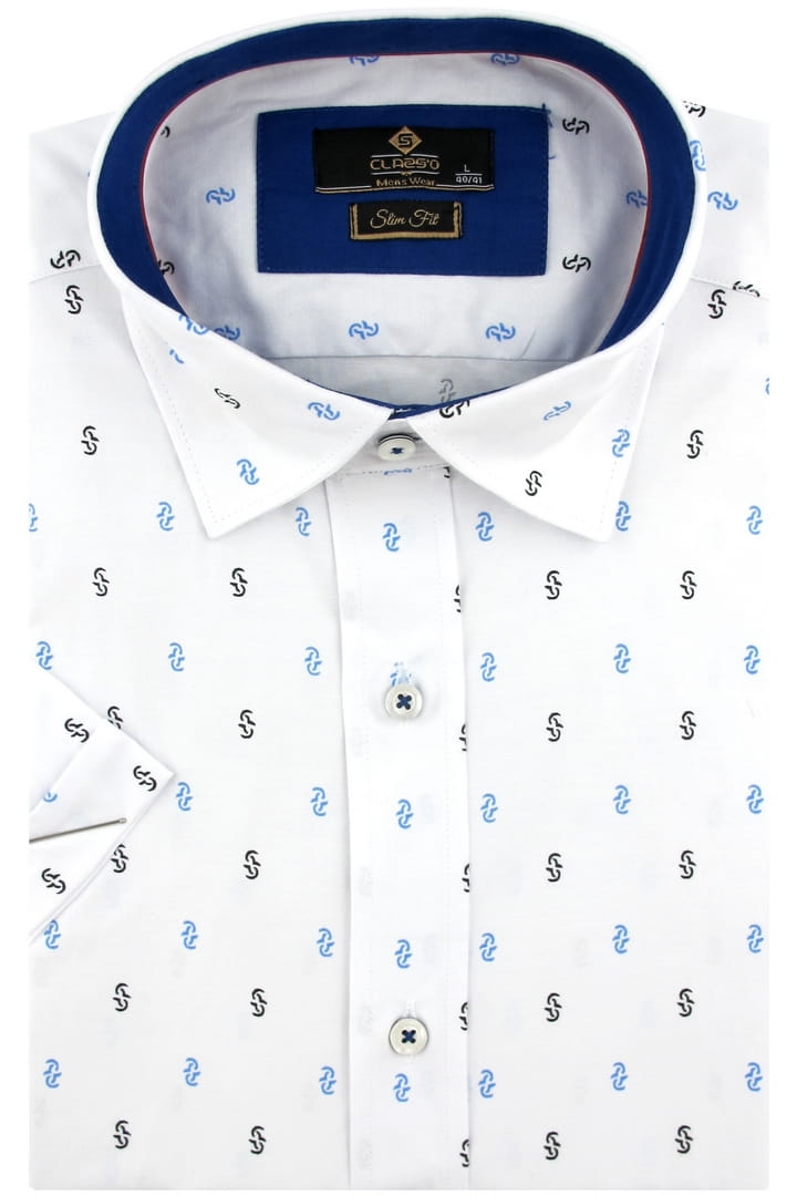 Koszula męska elegancka z krótkim rękawem we wzorki w kroju slim fit doskonale komponuje się z eleganckimi spodniami, chinosami oraz stylowymi jeansami. Można ją nosić zarówno w bardziej formalnych stylizacjach, jak i w wersji smart casual.