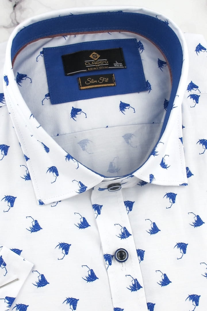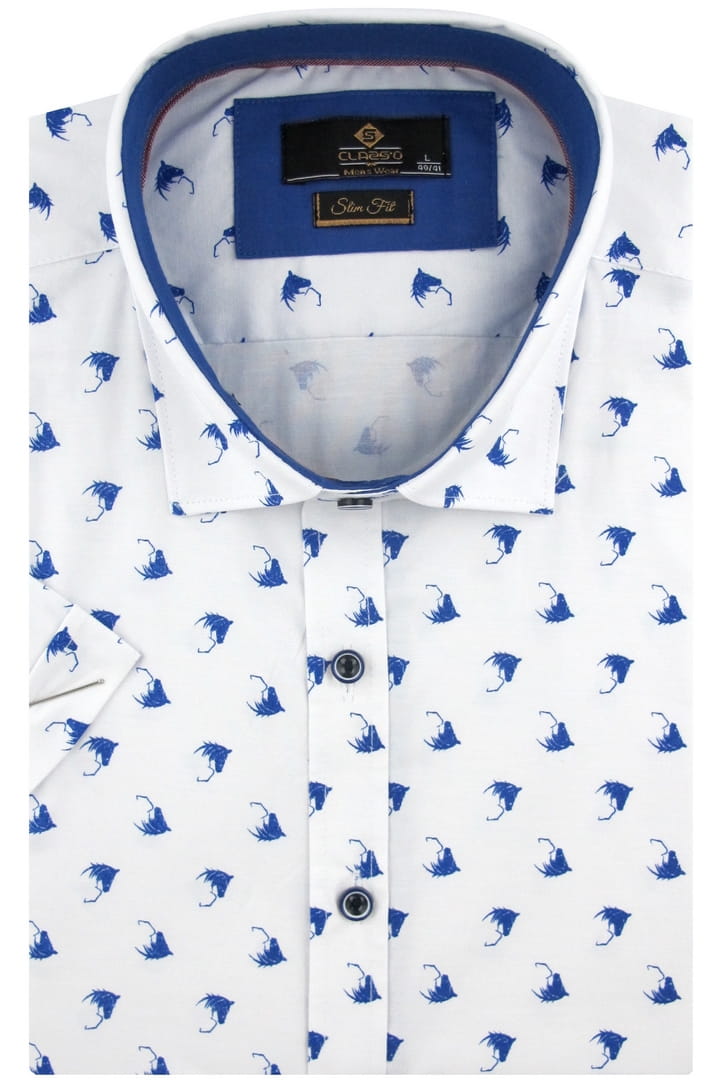 Koszula męska elegancka z krótkim rękawem we wzorki w kroju slim fit doskonale komponuje się z eleganckimi spodniami, chinosami oraz stylowymi jeansami. Można ją nosić zarówno w bardziej formalnych stylizacjach, jak i w wersji smart casual.