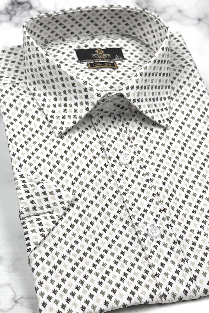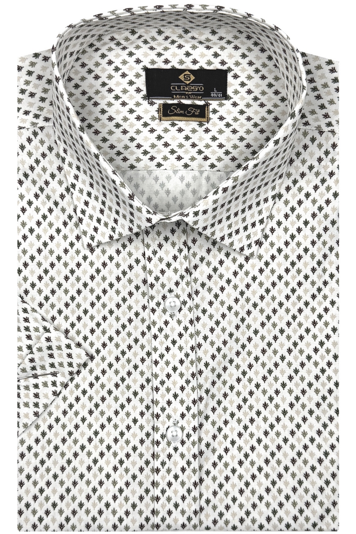 Koszula męska elegancka z krótkim rękawem we wzorki w kroju slim fit doskonale komponuje się z eleganckimi spodniami, chinosami oraz stylowymi jeansami. Można ją nosić zarówno w bardziej formalnych stylizacjach, jak i w wersji smart casual.