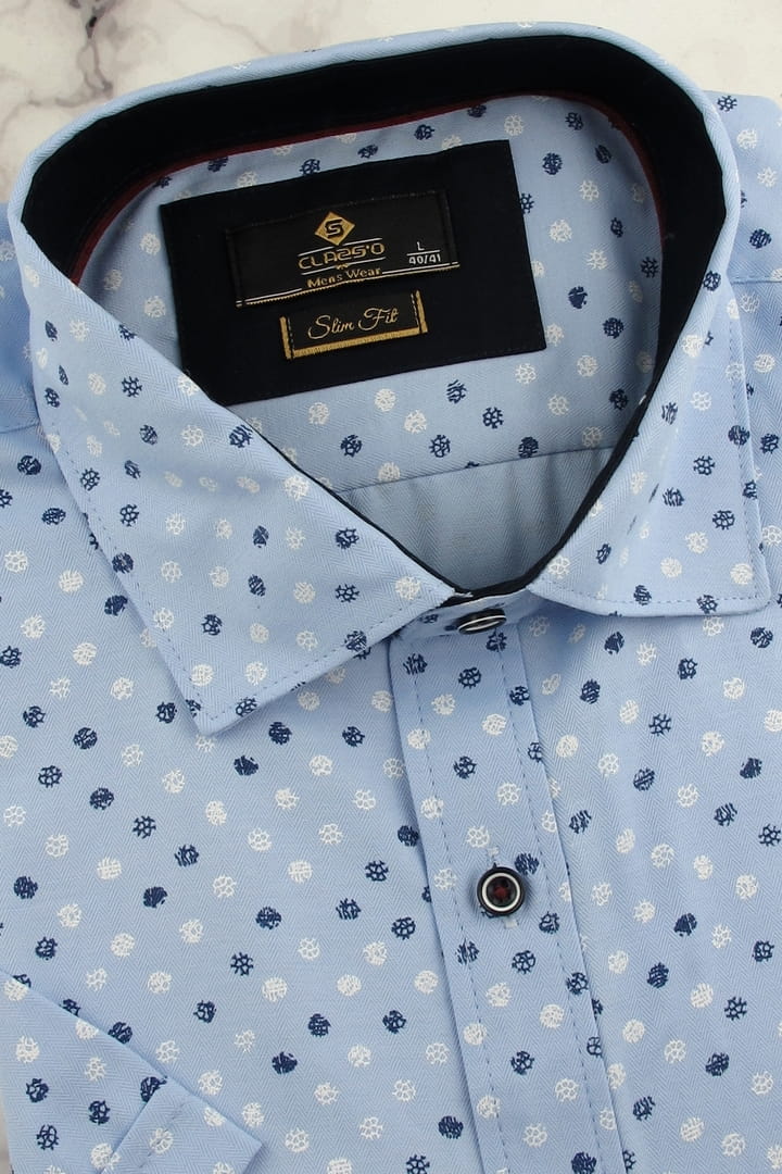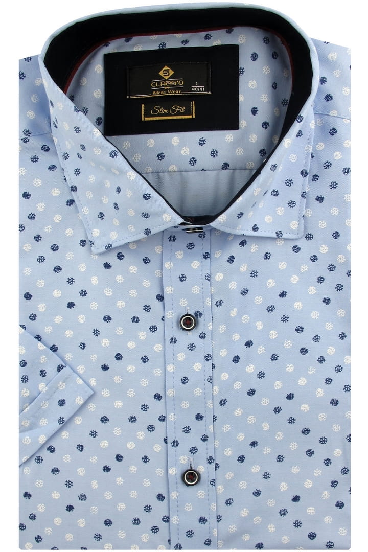 Koszula męska elegancka z krótkim rękawem we wzorki w kroju slim fit doskonale komponuje się z eleganckimi spodniami, chinosami oraz stylowymi jeansami. Można ją nosić zarówno w bardziej formalnych stylizacjach, jak i w wersji smart casual.