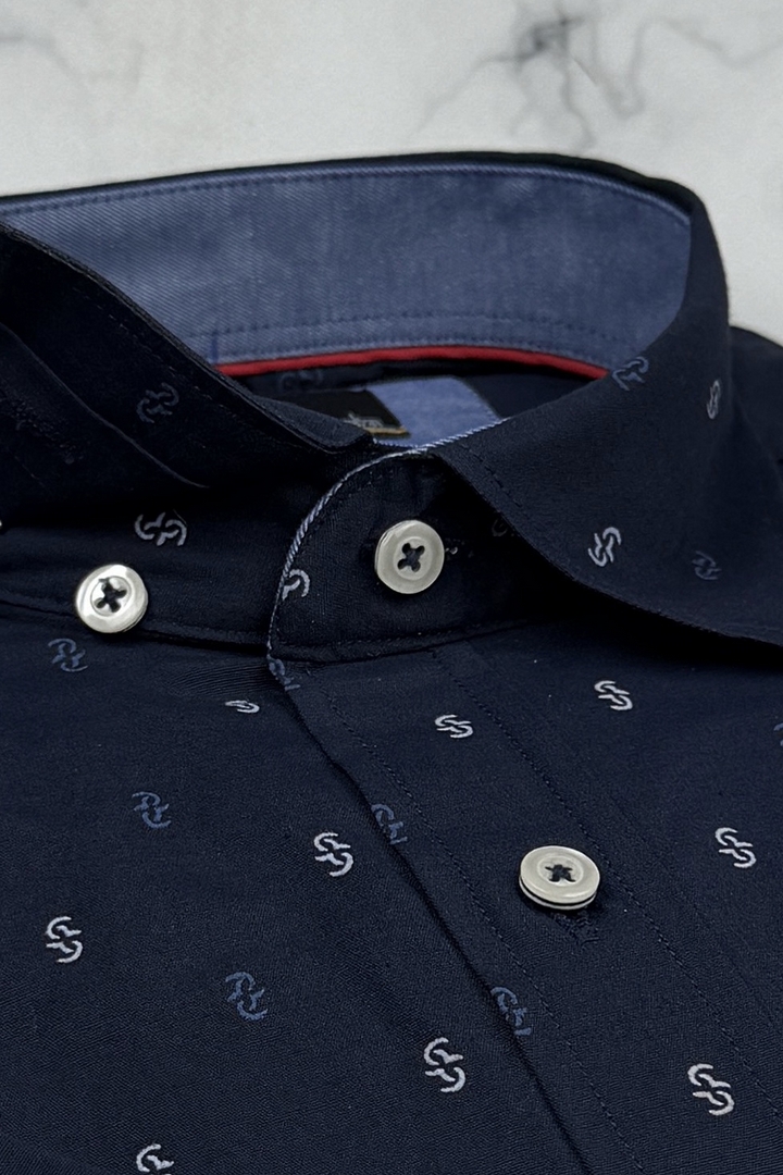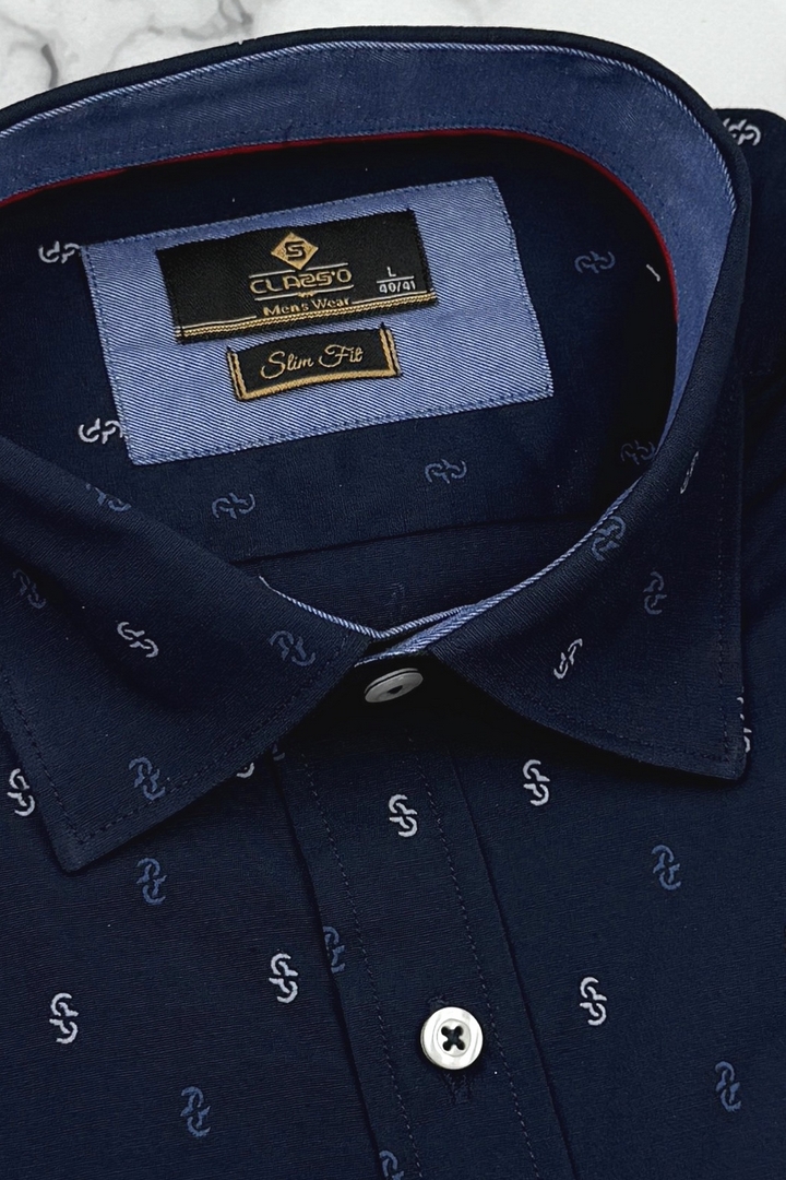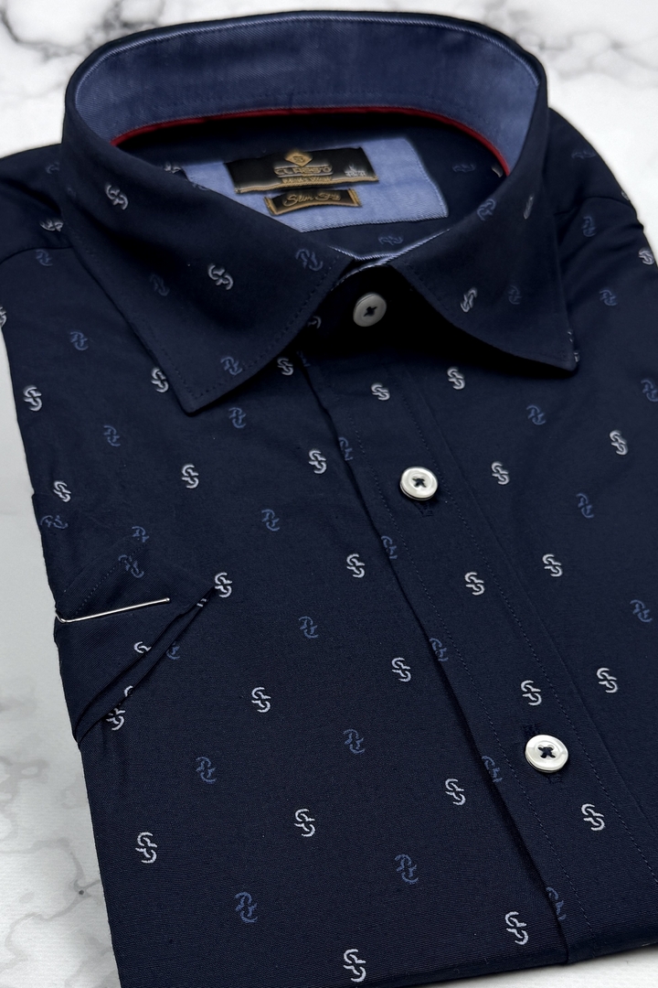 Koszula Męska Elegancka Granatowa we Wzorki Slim Fit Classo R429