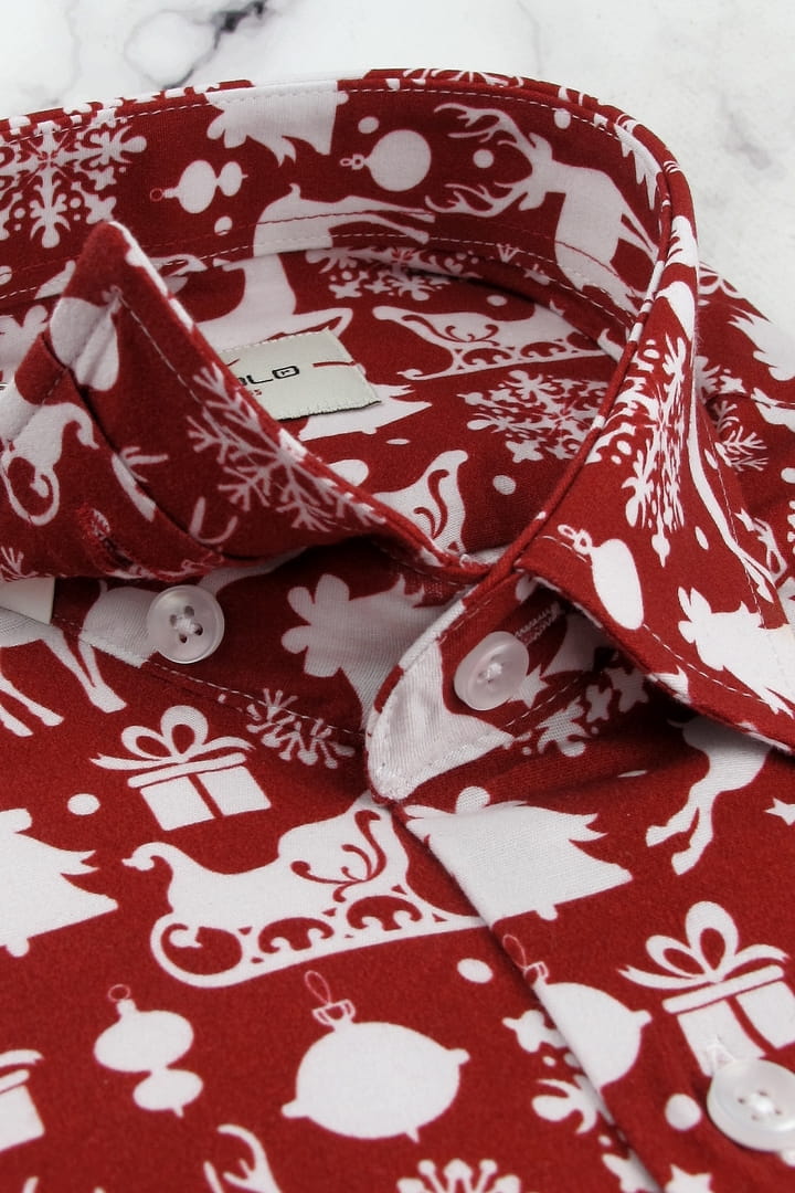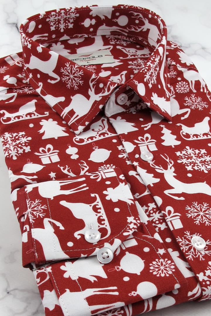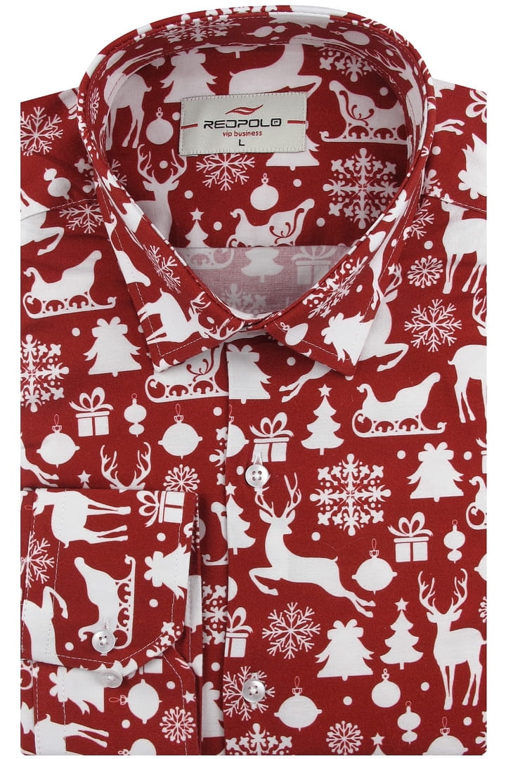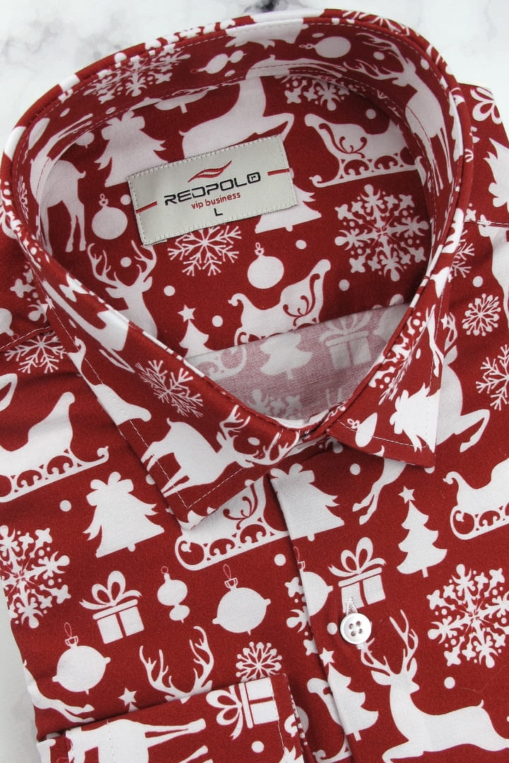 Koszula Męska Elegancka Na Święta czerwona z Motywem Świątecznym z długim rękawem w kroju SLIM FIT Redpolo H954