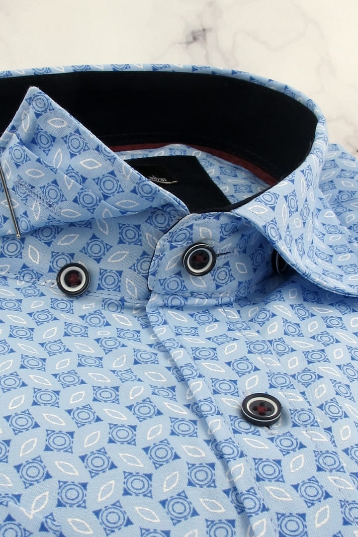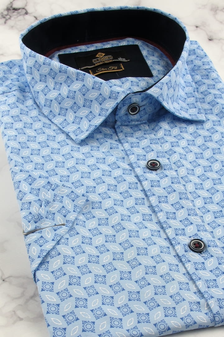 Koszula męska elegancka z krótkim rękawem we wzorki w kroju slim fit doskonale komponuje się z eleganckimi spodniami, chinosami oraz stylowymi jeansami. Można ją nosić zarówno w bardziej formalnych stylizacjach, jak i w wersji smart casual.