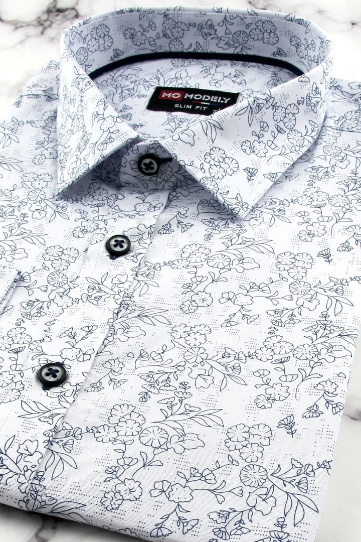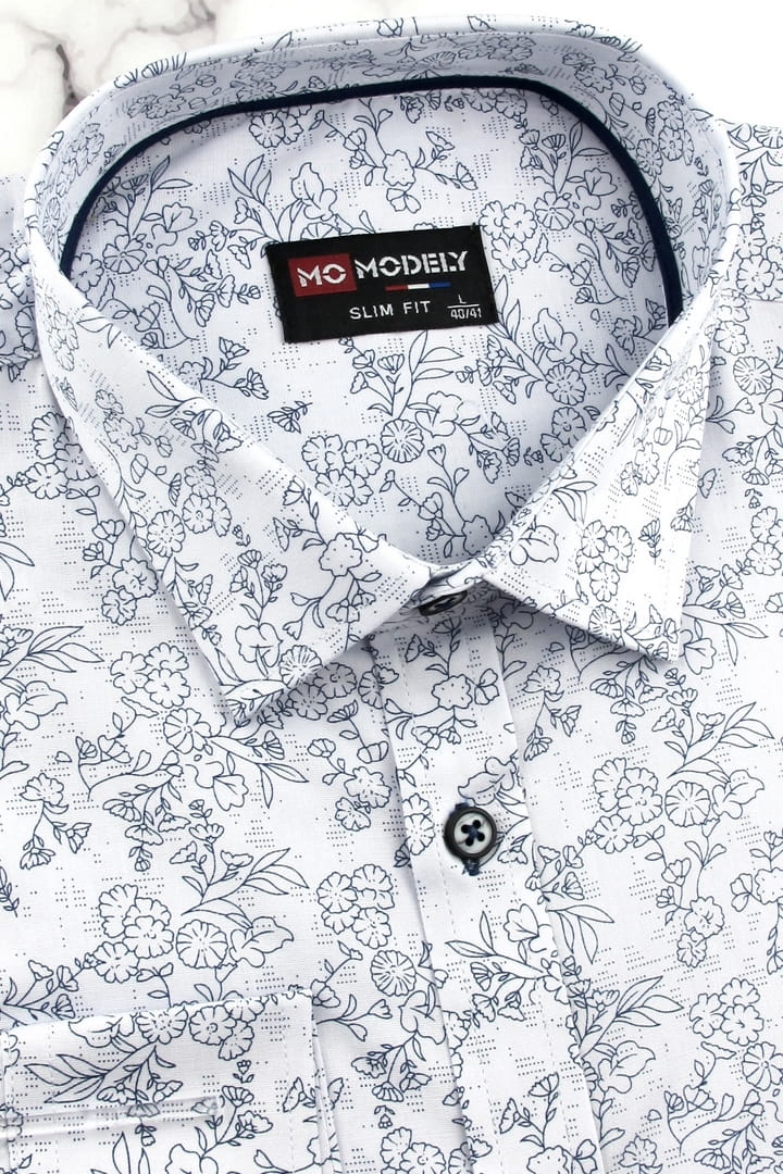 Koszula Męska Elegancka Wizytowa do garnituru biała w kwiatki z długim rękawem w kroju SLIM FIT Modely J401
