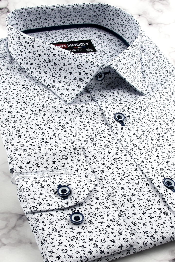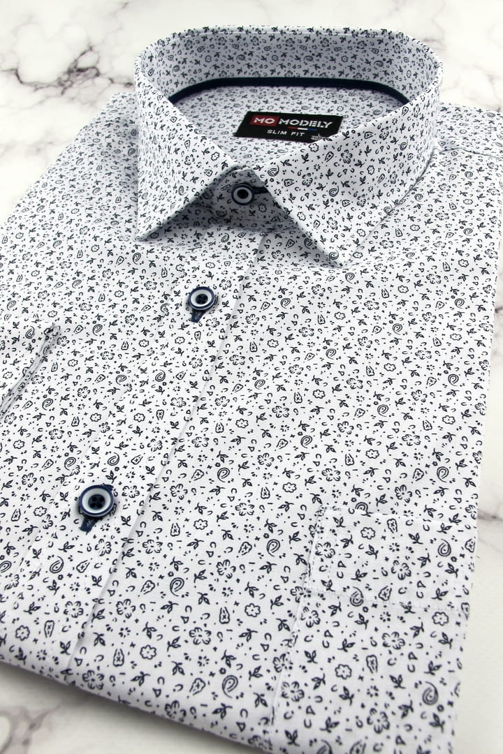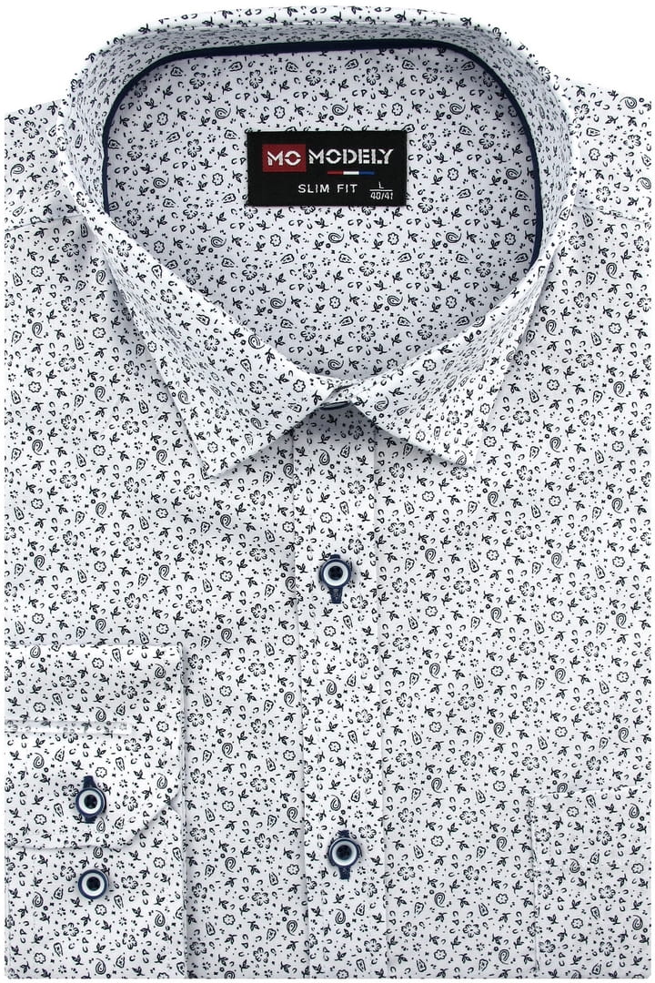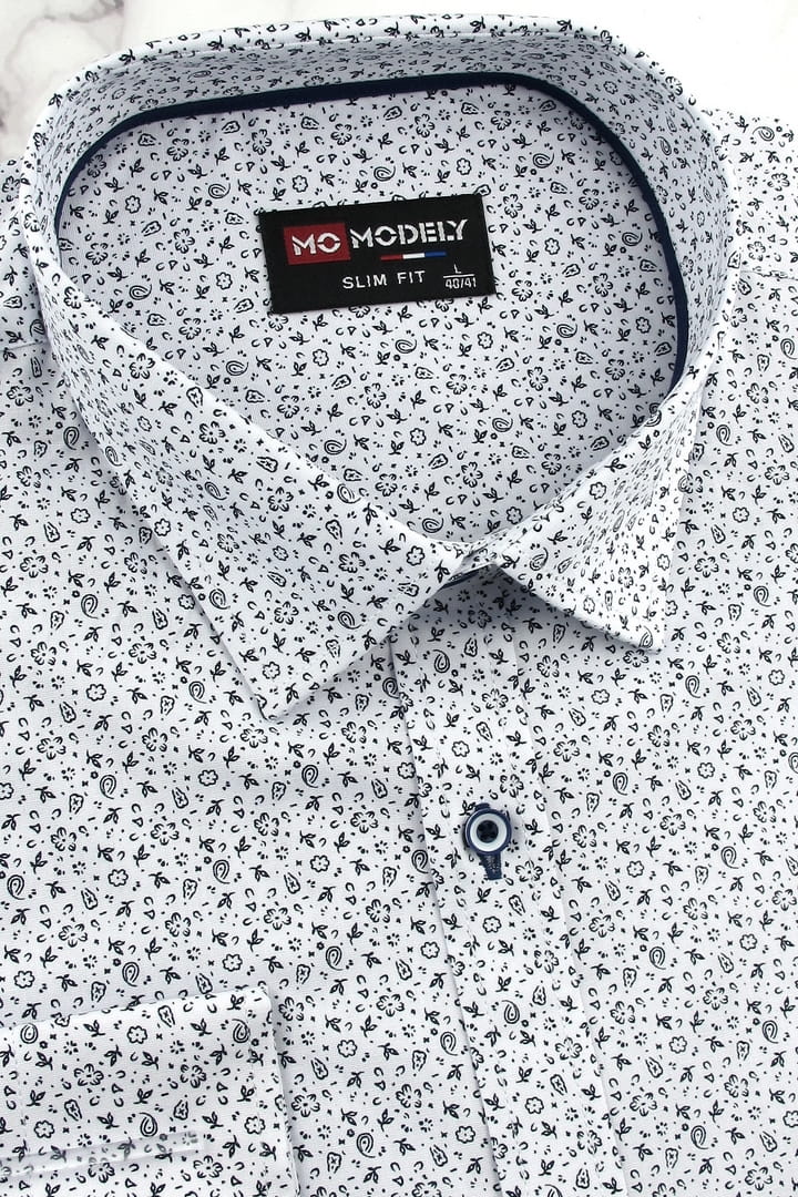 Koszula Męska Elegancka Wizytowa do garnituru biała we wzorki z długim rękawem w kroju SLIM FIT Modely H330