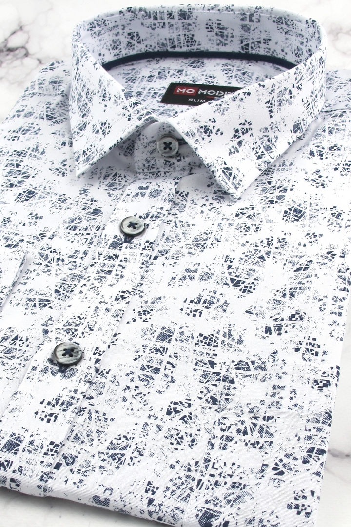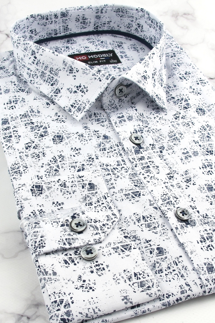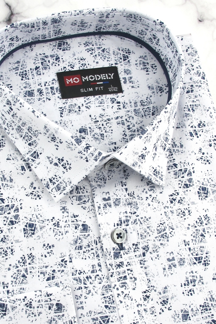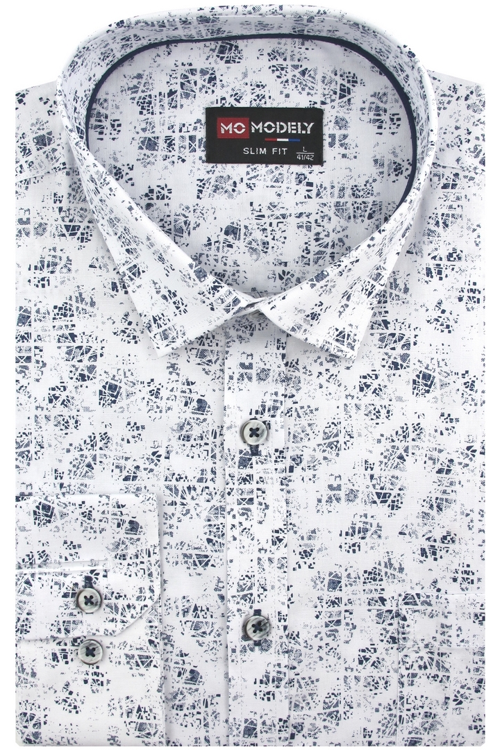 Koszula Męska Elegancka Wizytowa do garnituru biała we wzorki z długim rękawem w kroju SLIM FIT Modely J909