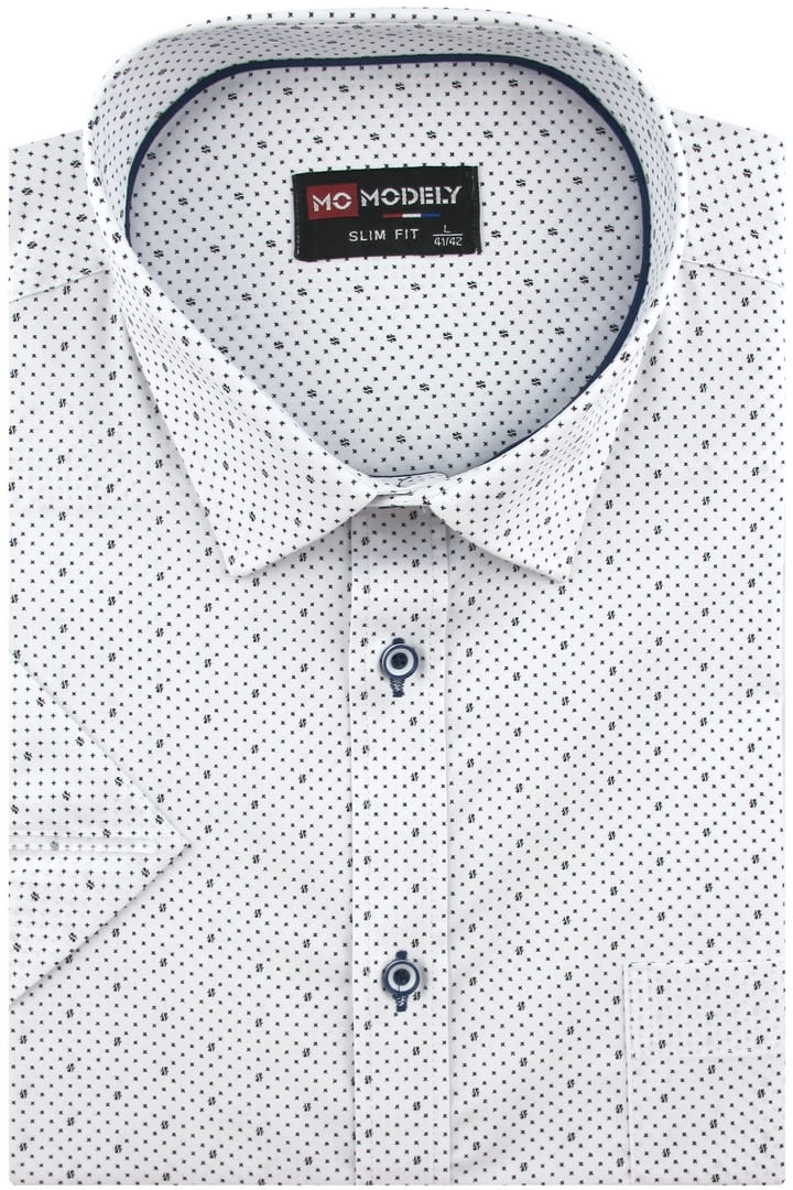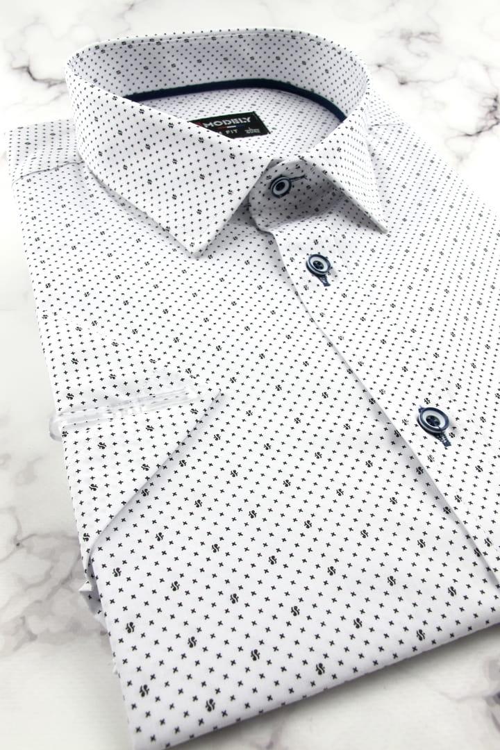Koszula Męska Elegancka Wizytowa do garnituru biała we wzorki z krótkim rękawem w kroju SLIM FIT Modely P532