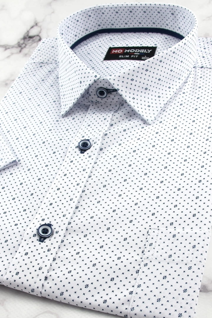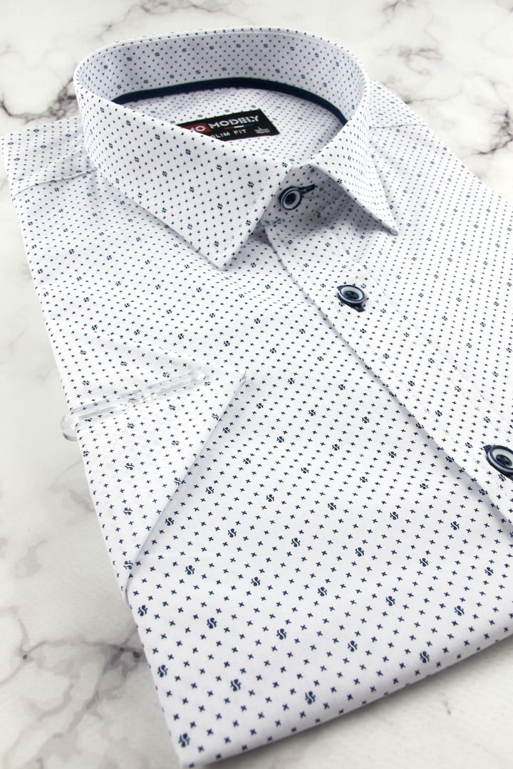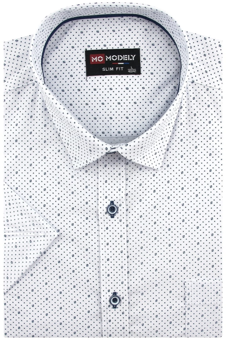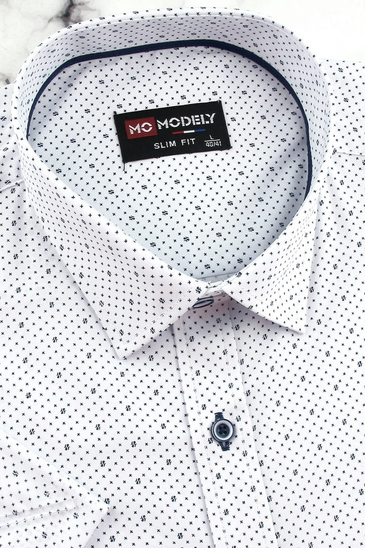 Koszula Męska Elegancka Wizytowa do garnituru biała we wzorki z krótkim rękawem w kroju SLIM FIT Modely P807