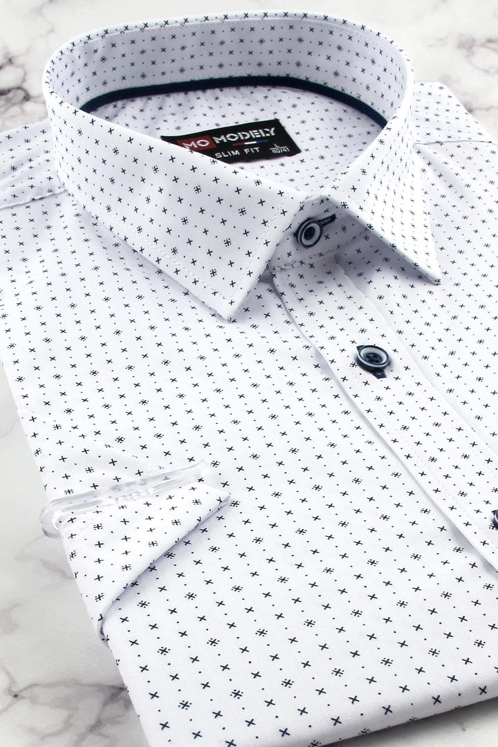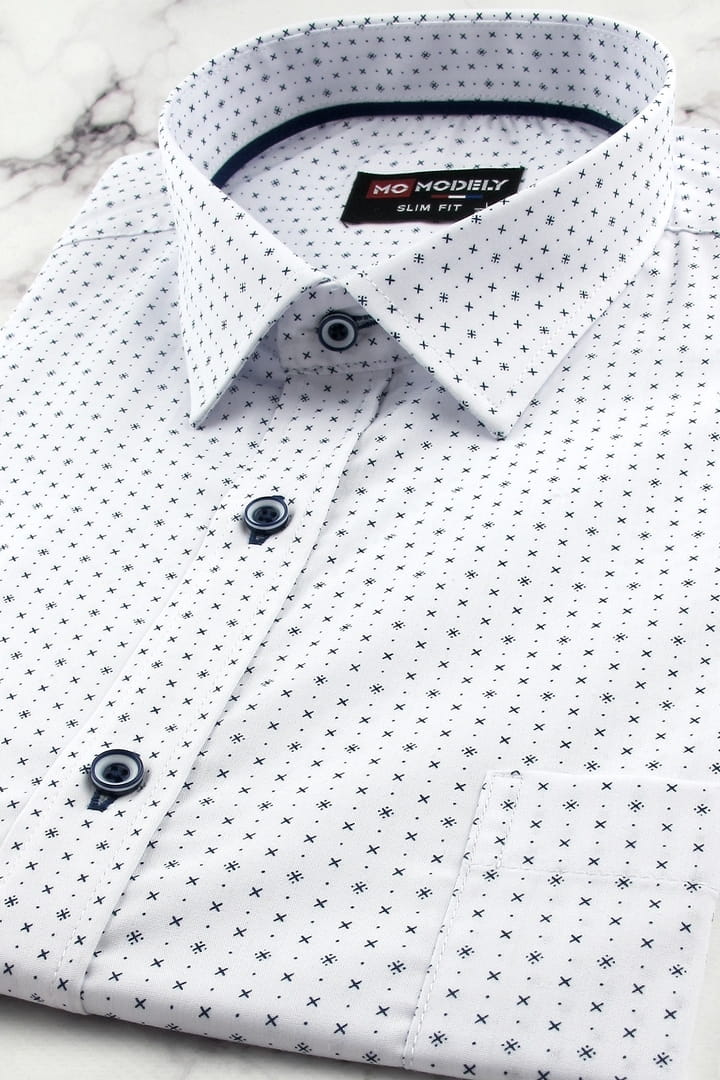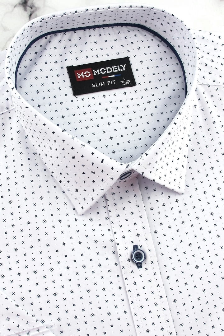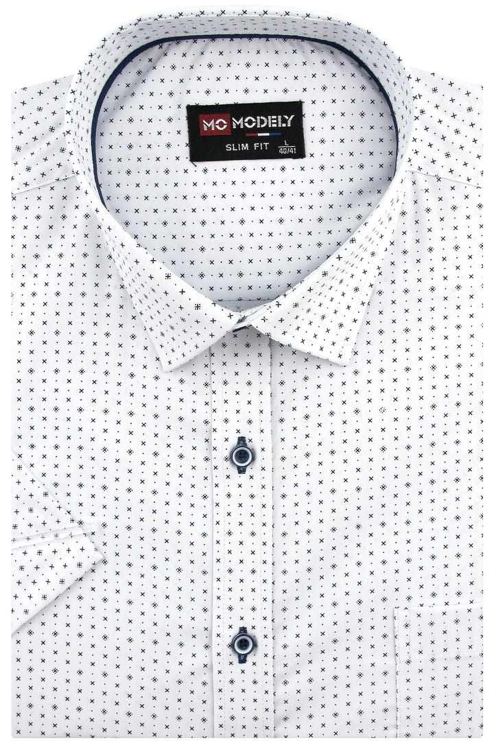Koszula Męska Elegancka Wizytowa do garnituru biała we wzorki z krótkim rękawem w kroju SLIM FIT Modely P808