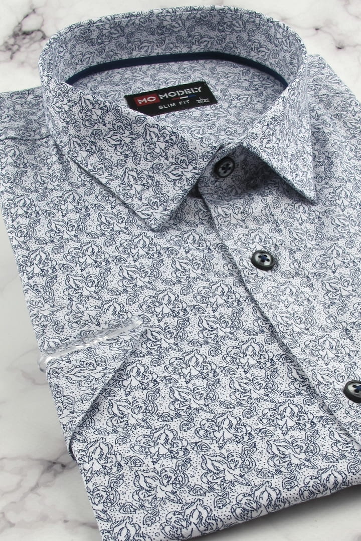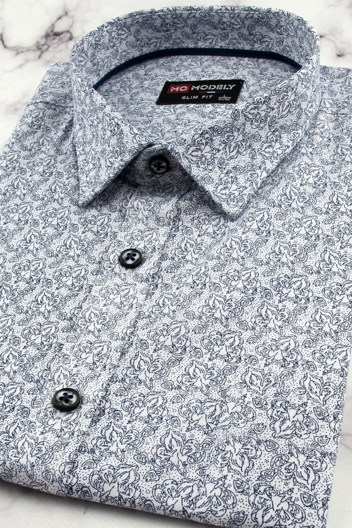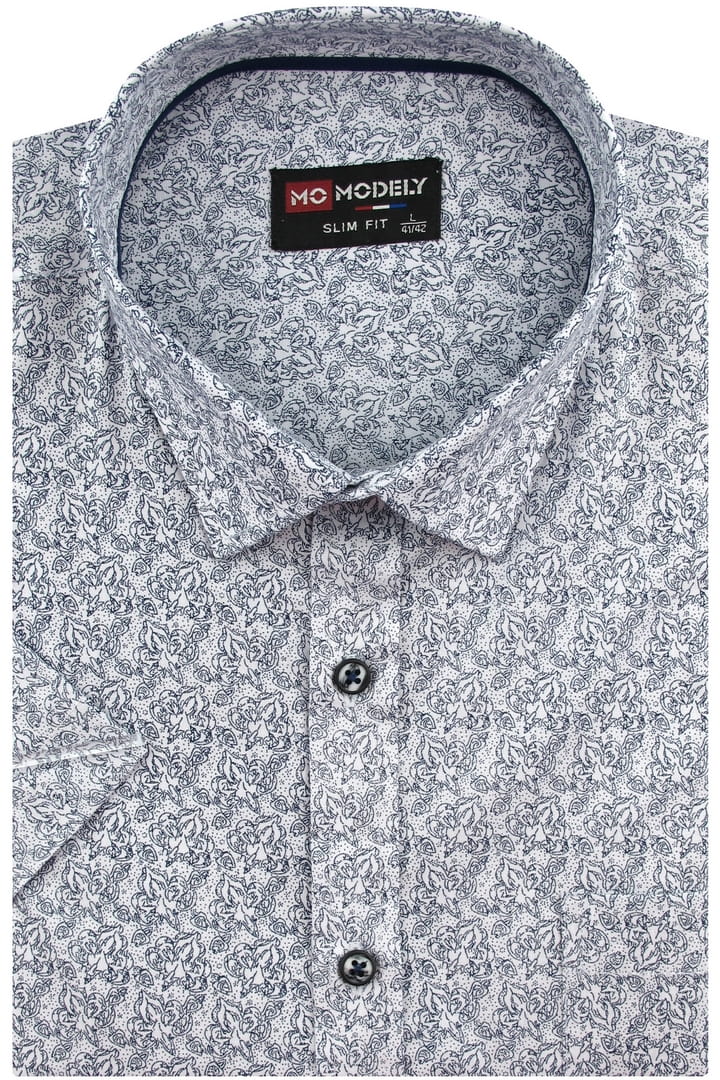 Koszula Męska Elegancka Wizytowa do garnituru biała we wzorki z krótkim rękawem w kroju SLIM FIT Modely P825