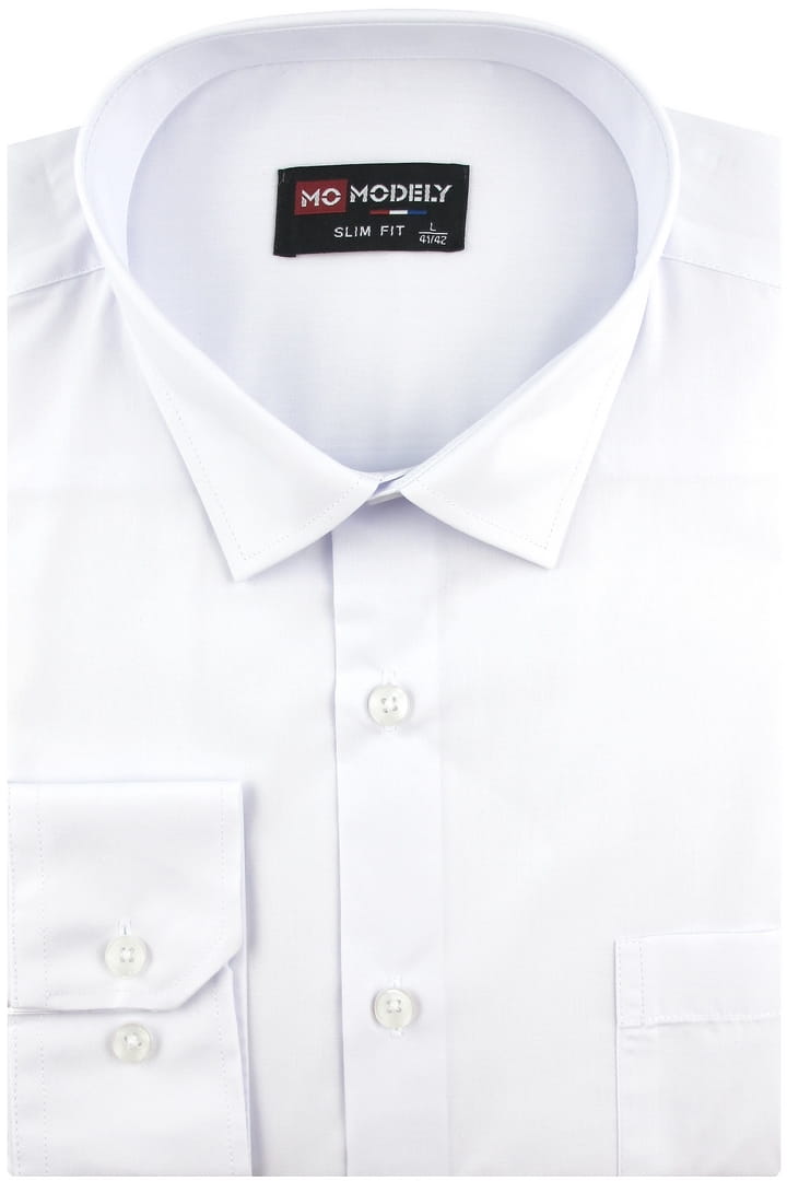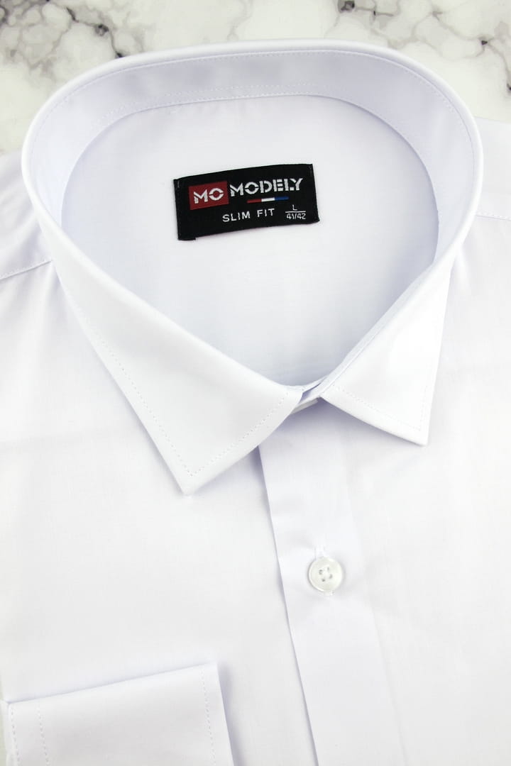 Koszula Męska Elegancka Wizytowa do garnituru gładka biała z długim rękawem w kroju SLIM FIT Modely J457