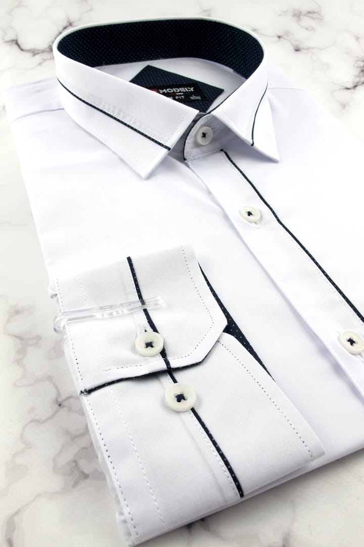 Koszula Męska Elegancka Wizytowa do garnituru gładka biała z lamówką z długim rękawem w kroju SLIM FIT Modely J420