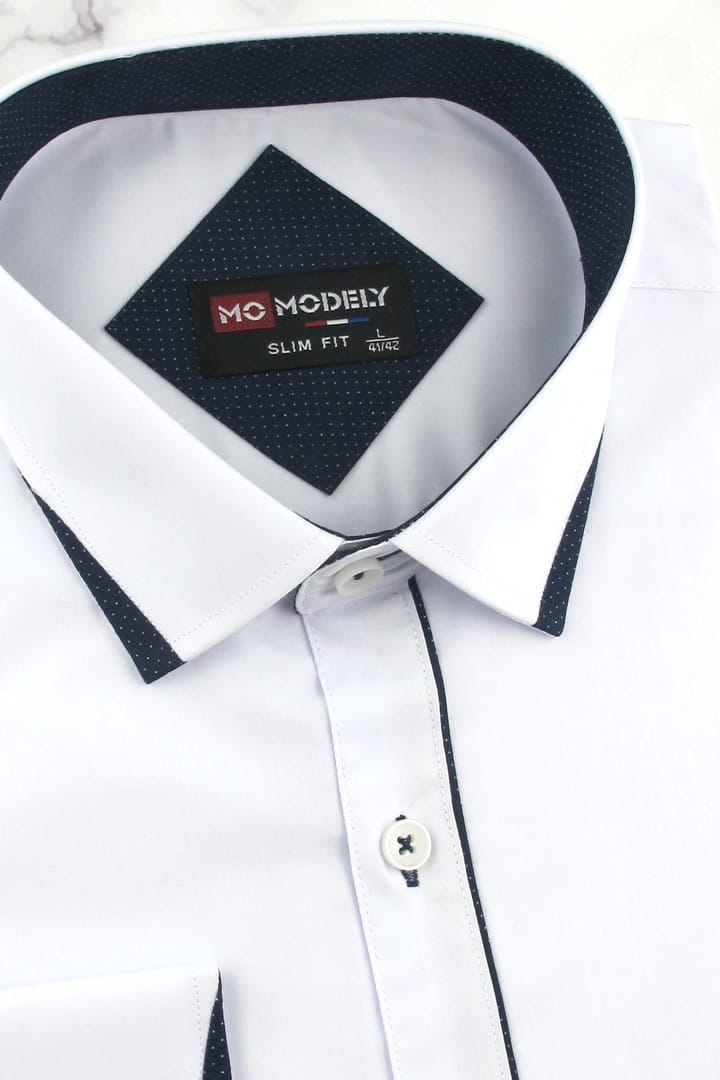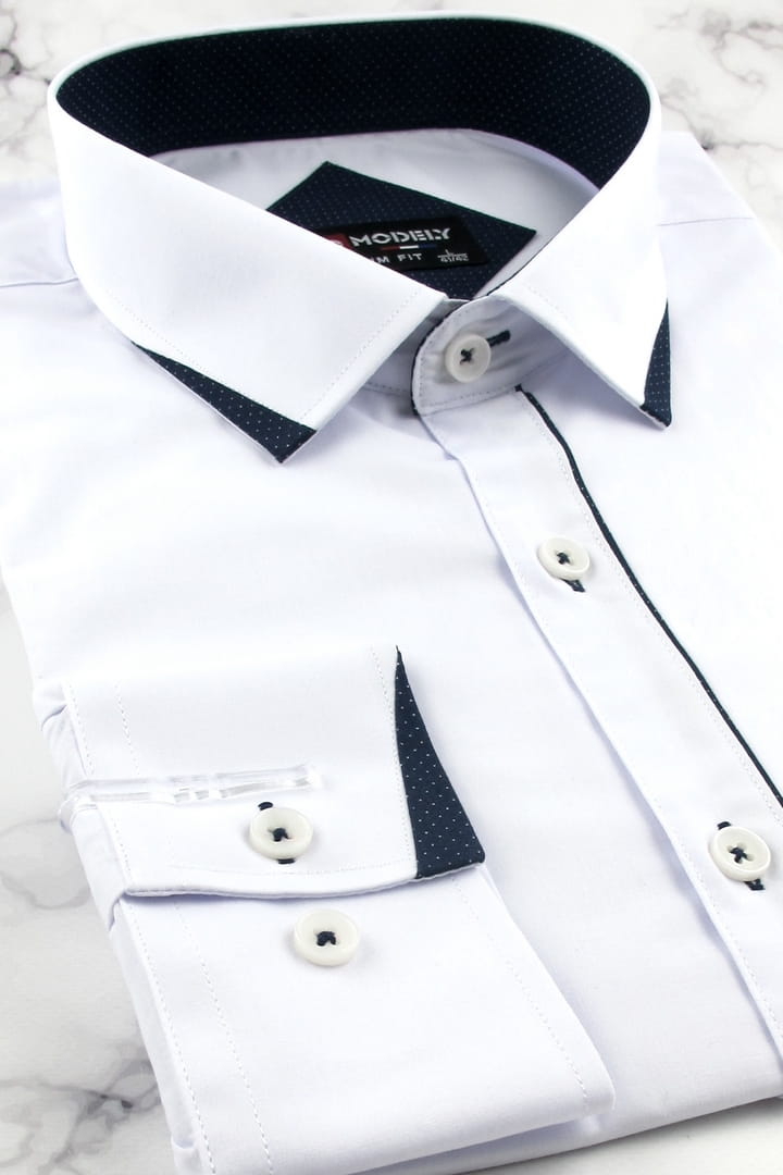 Koszula Męska Elegancka Wizytowa do garnituru gładka biała z lamówką z długim rękawem w kroju SLIM FIT Modely J468