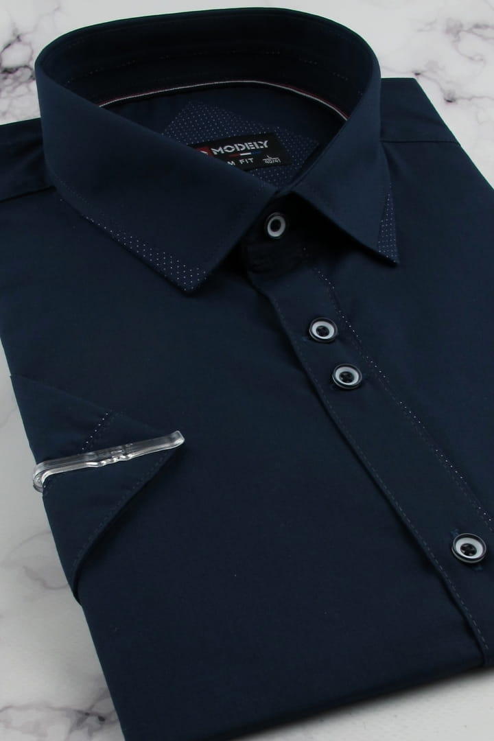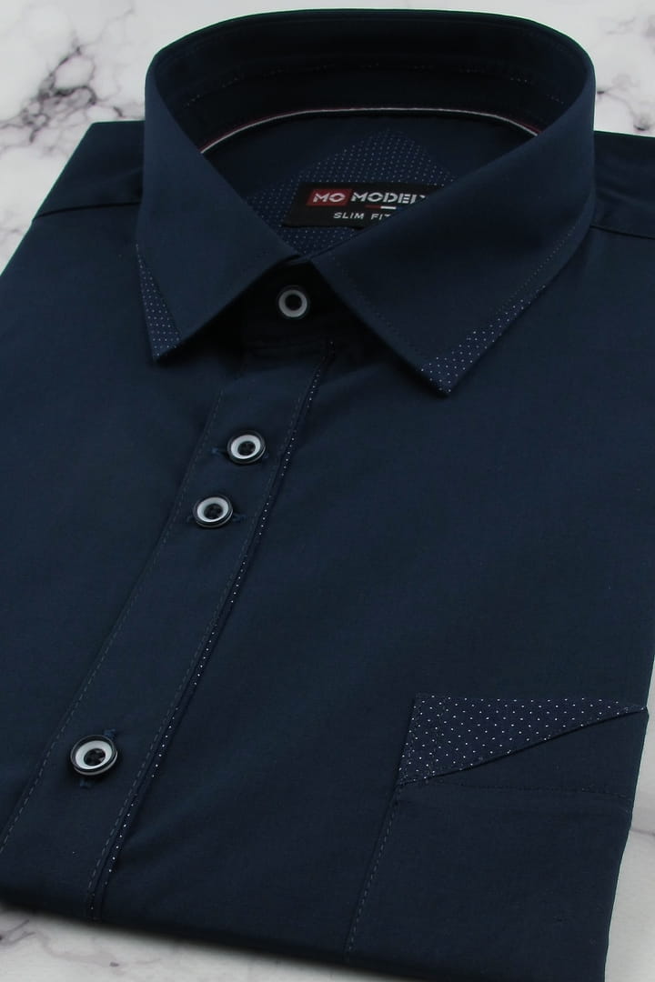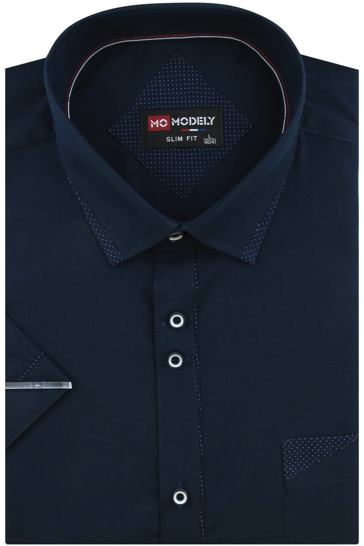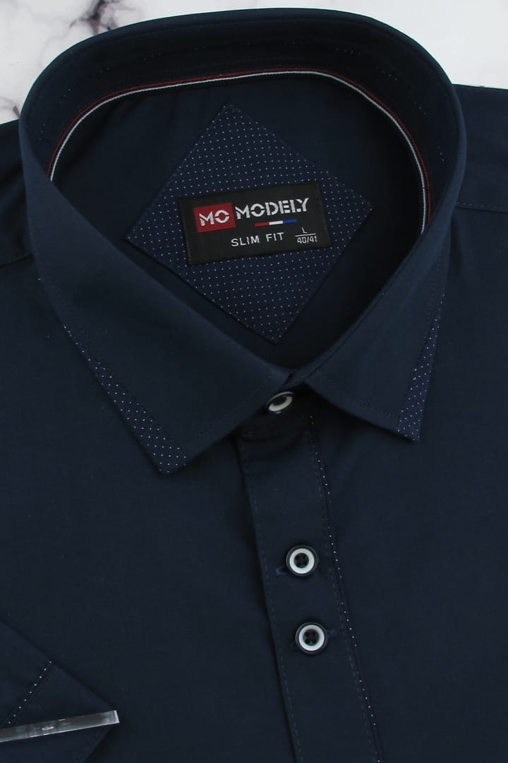 Koszula Męska Elegancka Wizytowa do garnituru gładka granatowa z lamówką z krótkim rękawem w kroju SLIM FIT Modely P770