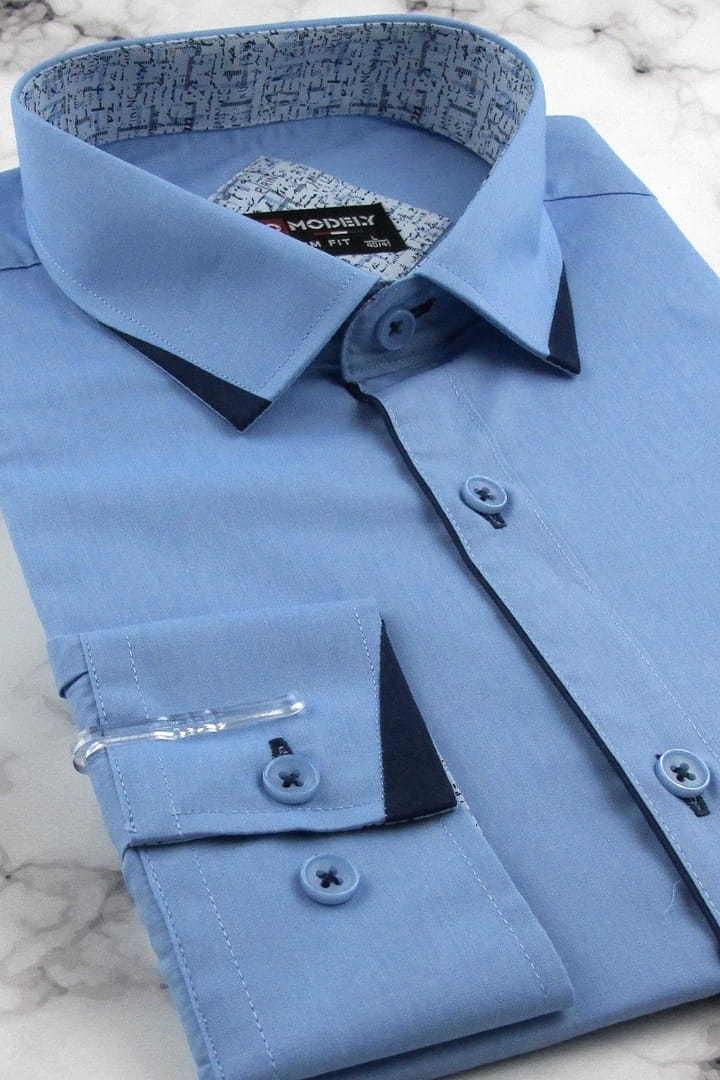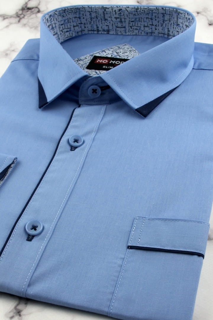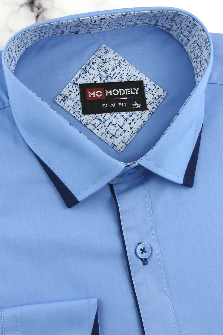 Koszula Męska Elegancka Wizytowa do garnituru gładka niebieska z lamówką z długim rękawem w kroju SLIM FIT Modely H556