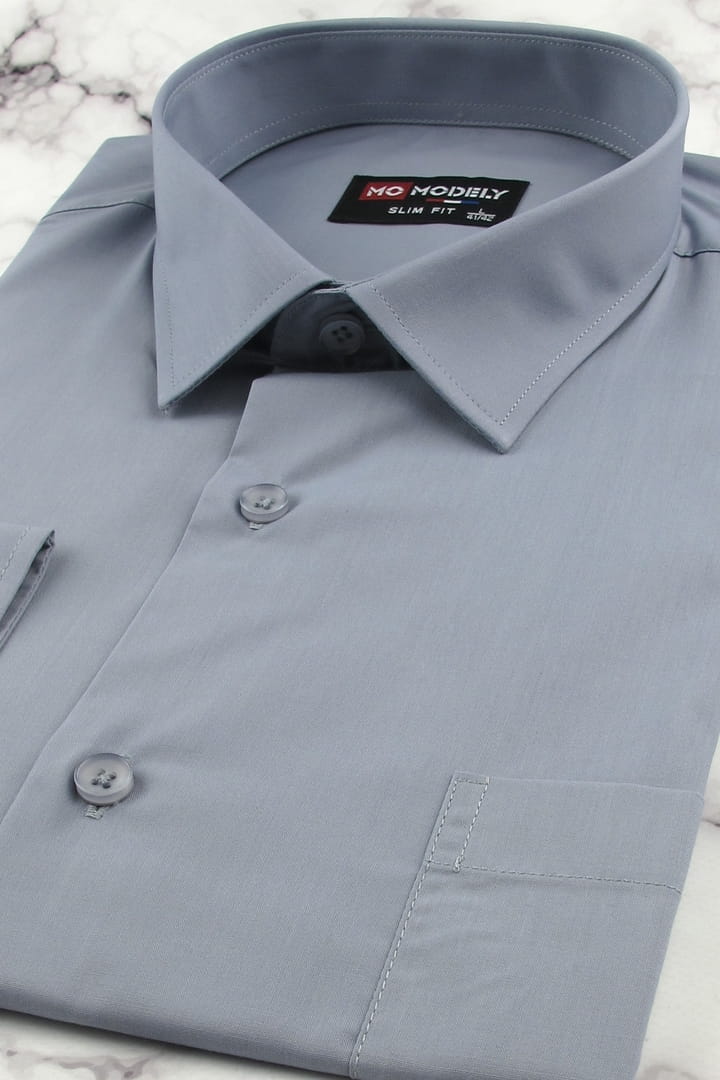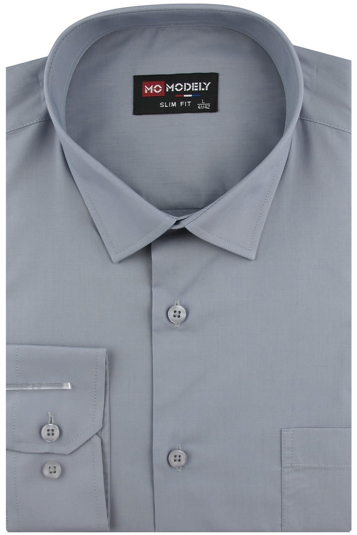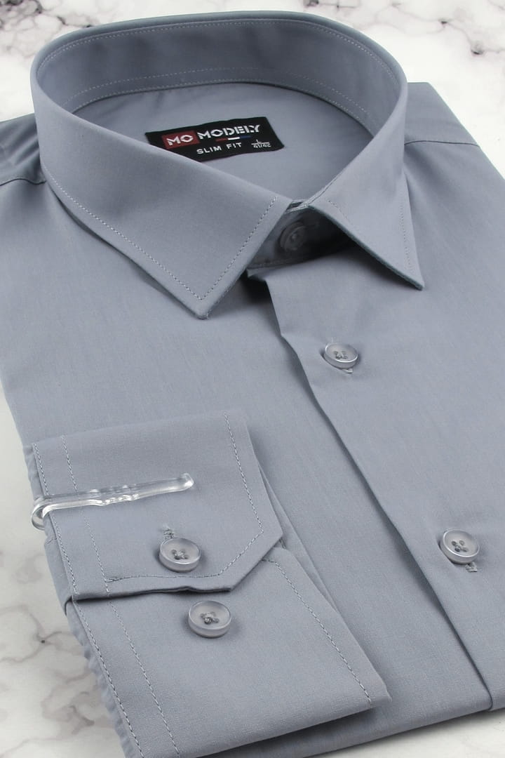 Koszula Męska Elegancka Wizytowa do garnituru gładka szara z długim rękawem w kroju SLIM FIT Modely J918