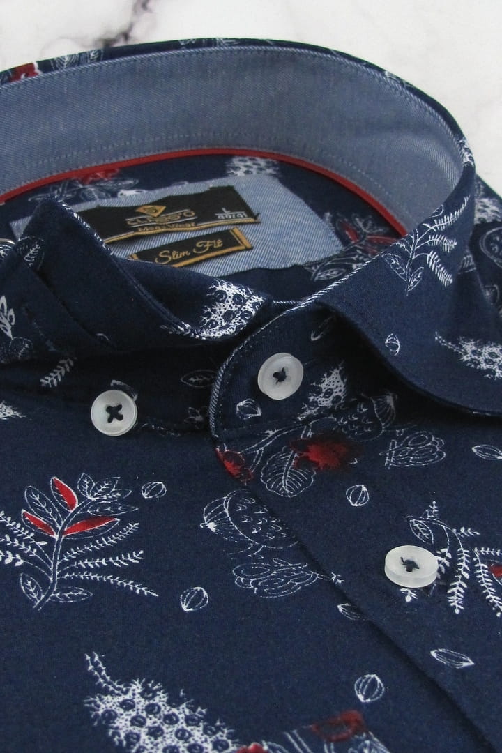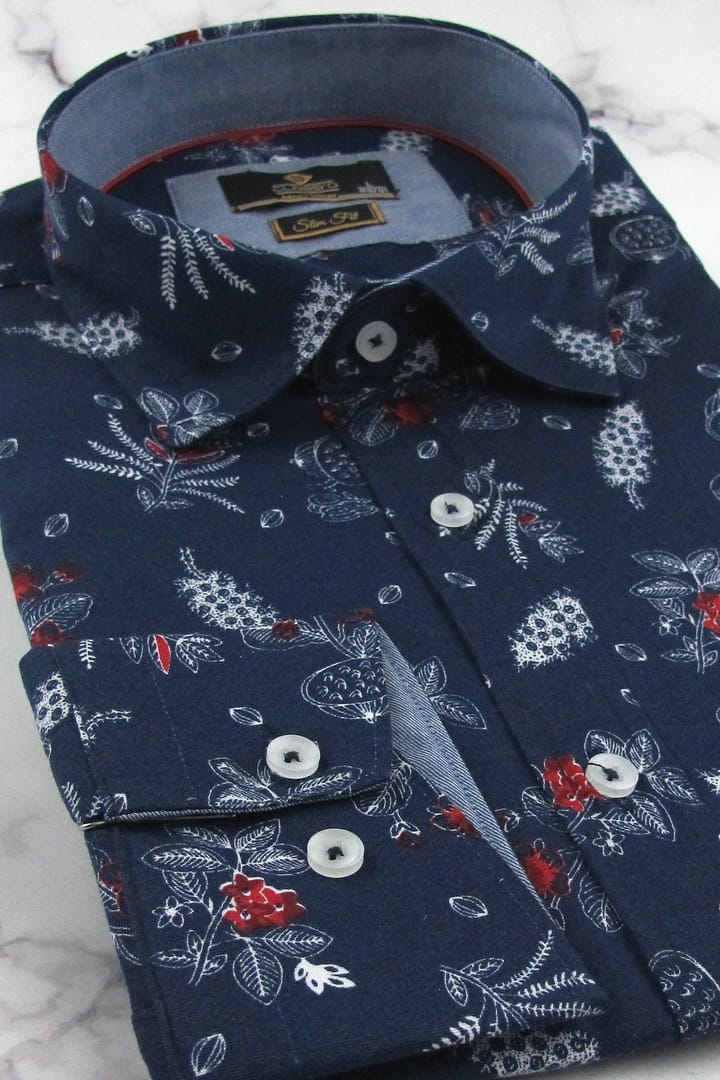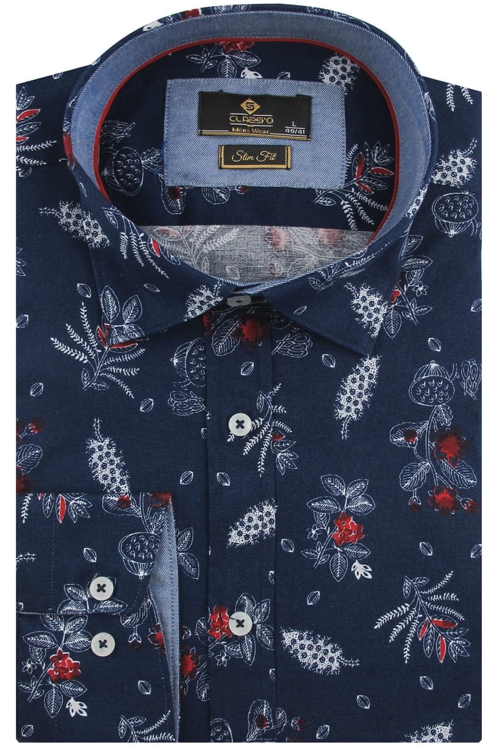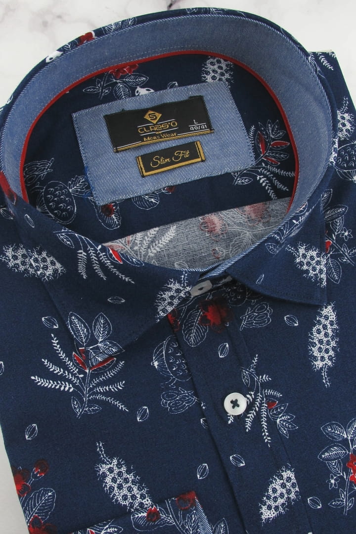 Koszula Męska Elegancka Wizytowa do garnituru granatowa w kwiaty z długim rękawem w kroju SLIM FIT Classo H942