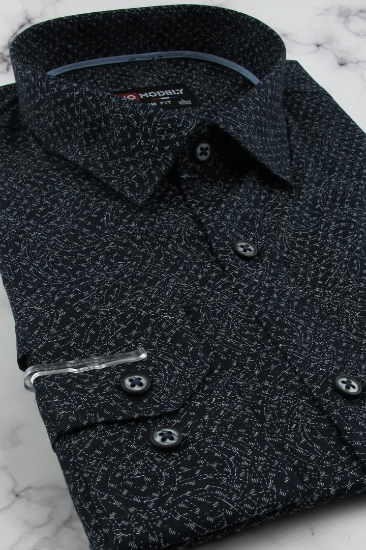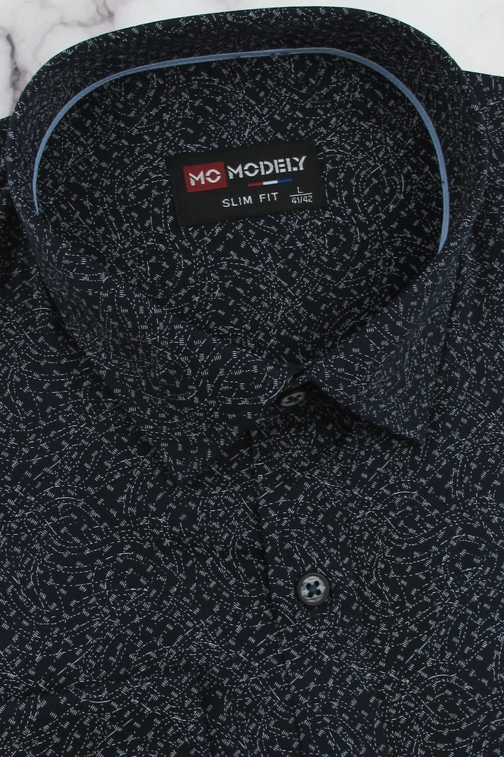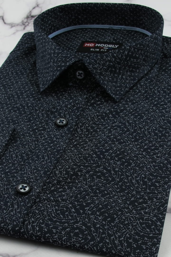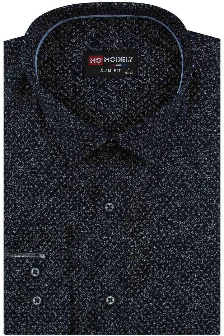 Koszula Męska Elegancka Wizytowa do garnituru granatowa we wzorki z długim rękawem w kroju SLIM FIT Modely H483