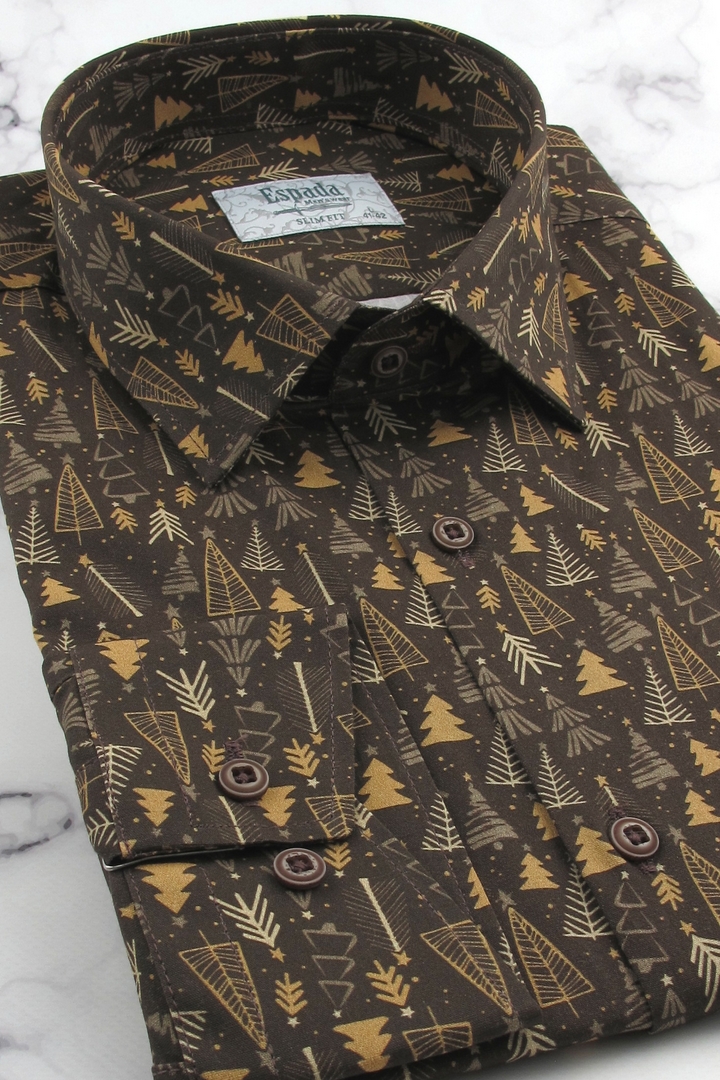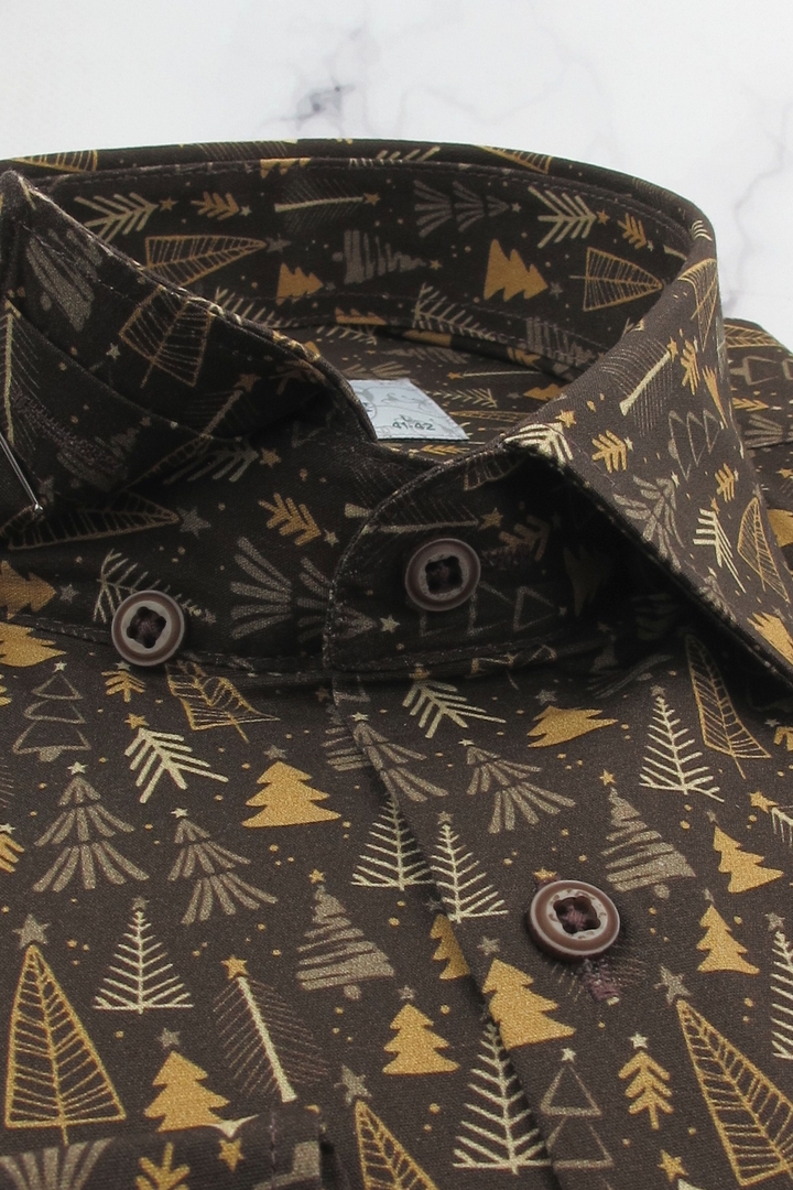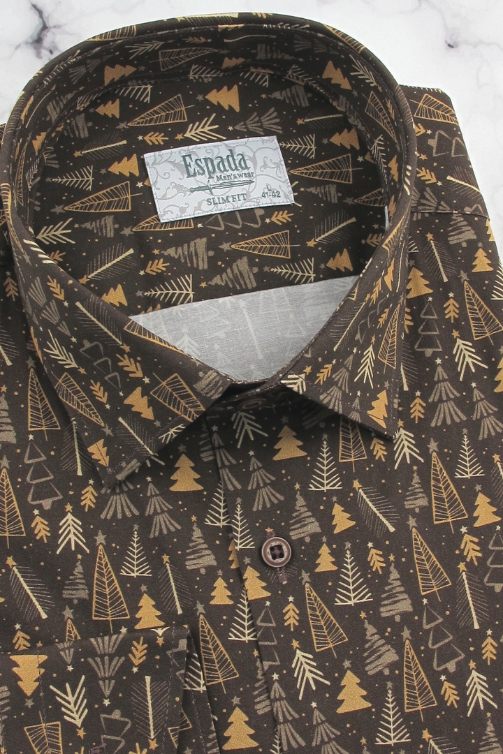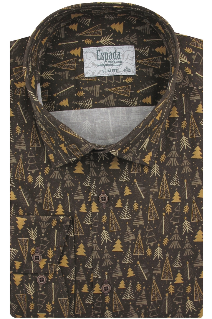 Koszula Męska Elegancka na Święta brązowa z Motywem Świątecznym z długim rękawem w kroju SLIM FIT Espada Men's Wear L040