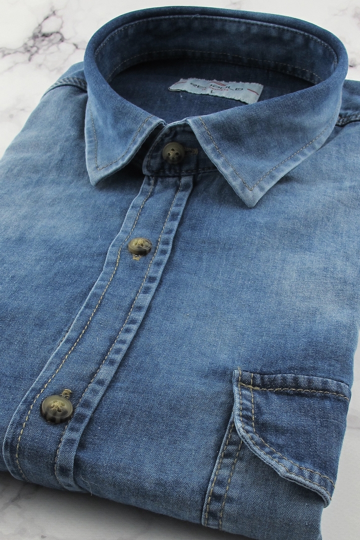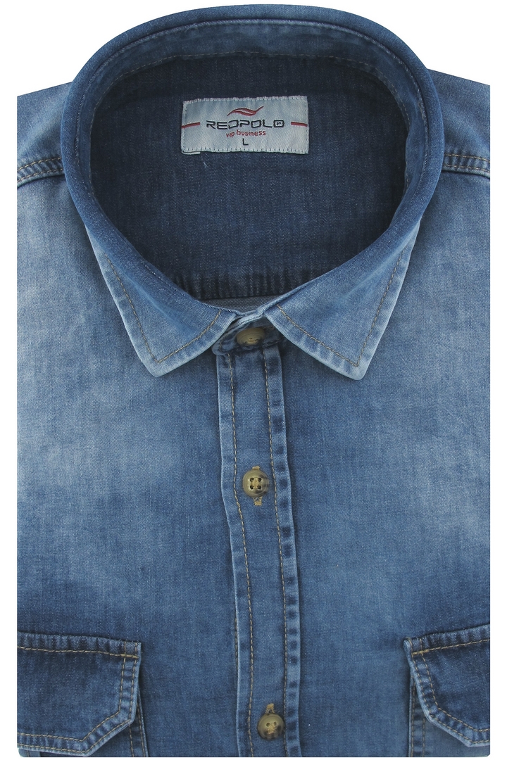 Koszula Męska Jeansowa Dżinsowa Casual gładka granatowa z długim rękawem w kroju SLIM FIT Redpolo J617