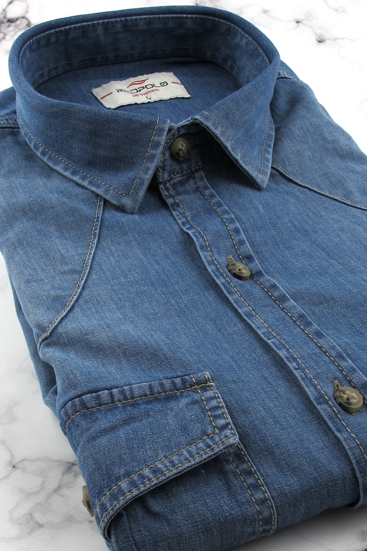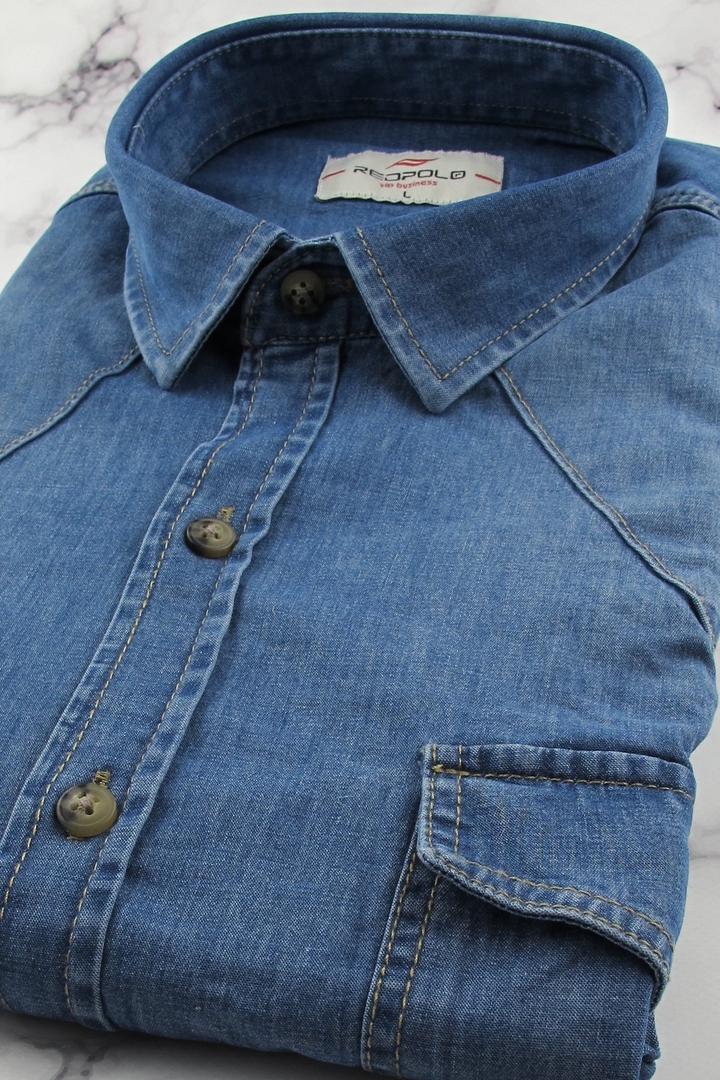 Koszula Męska Jeansowa Dżinsowa Casual gładka granatowa z długim rękawem w kroju SLIM FIT Redpolo J623