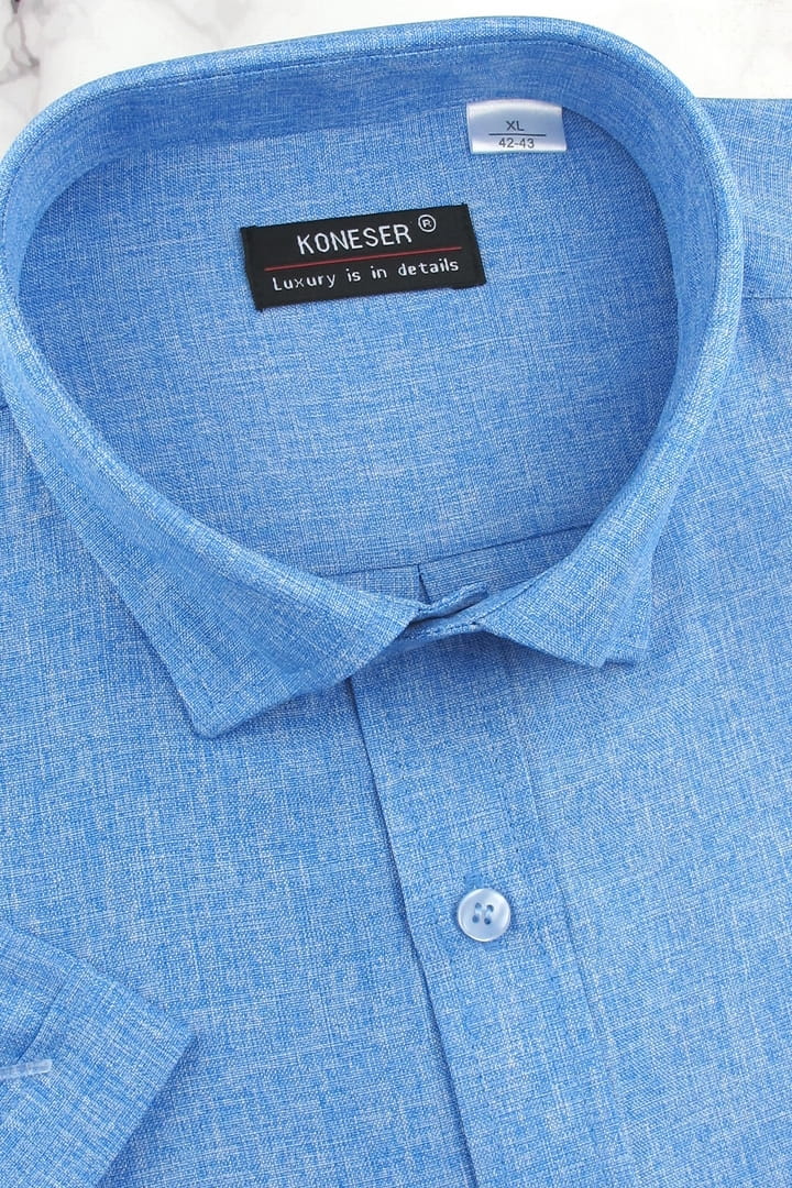 Koszula Męska Lniana Casual Gładka Niebieska Regular Koneser R488