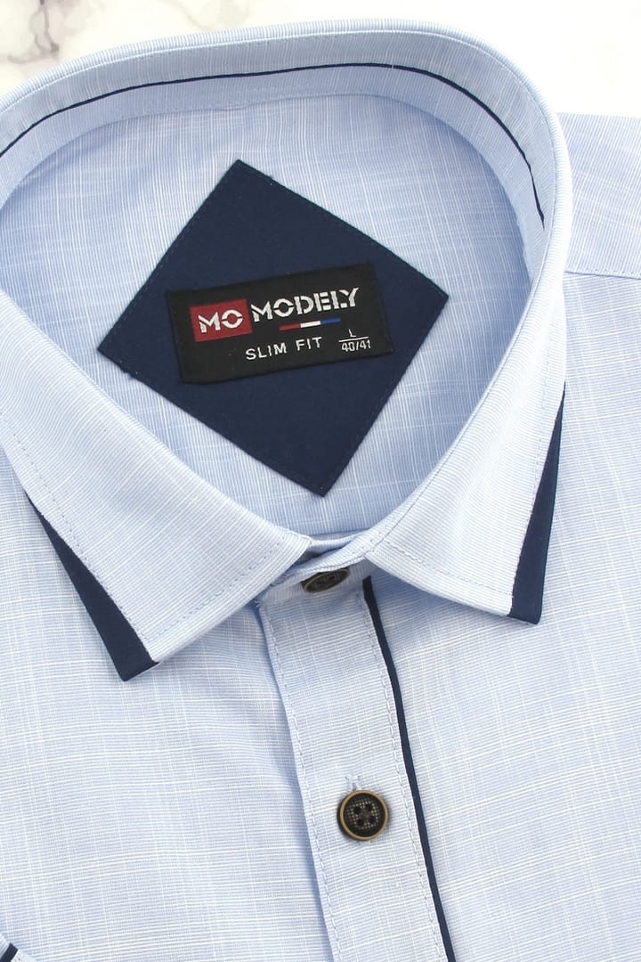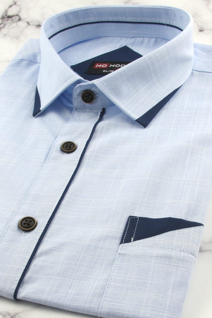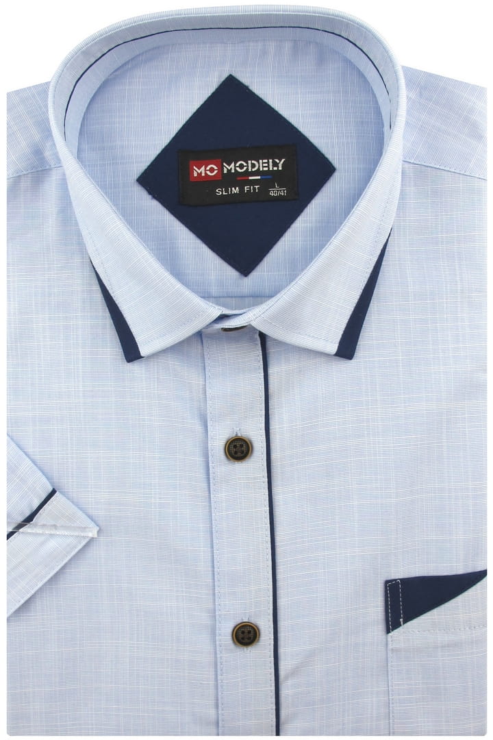 Lniana Duża Koszula Męska Codzienna Casual gładka błękitna z lamówką z krótkim rękawem Duże rozmiary P894