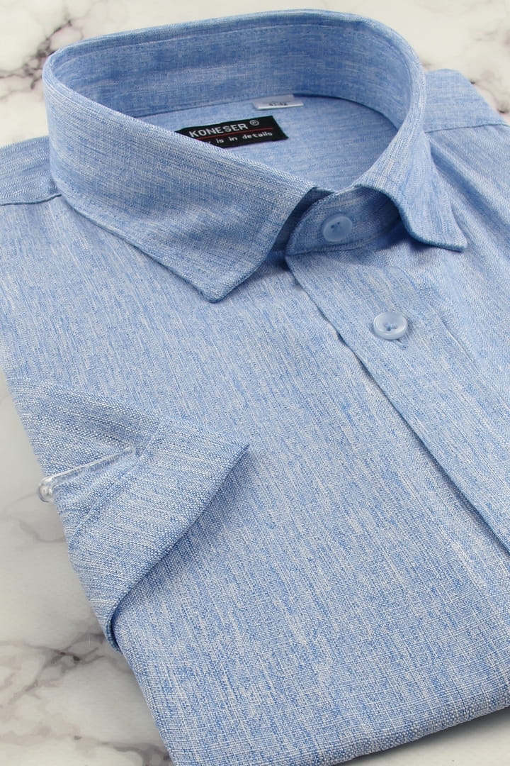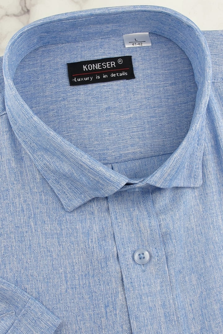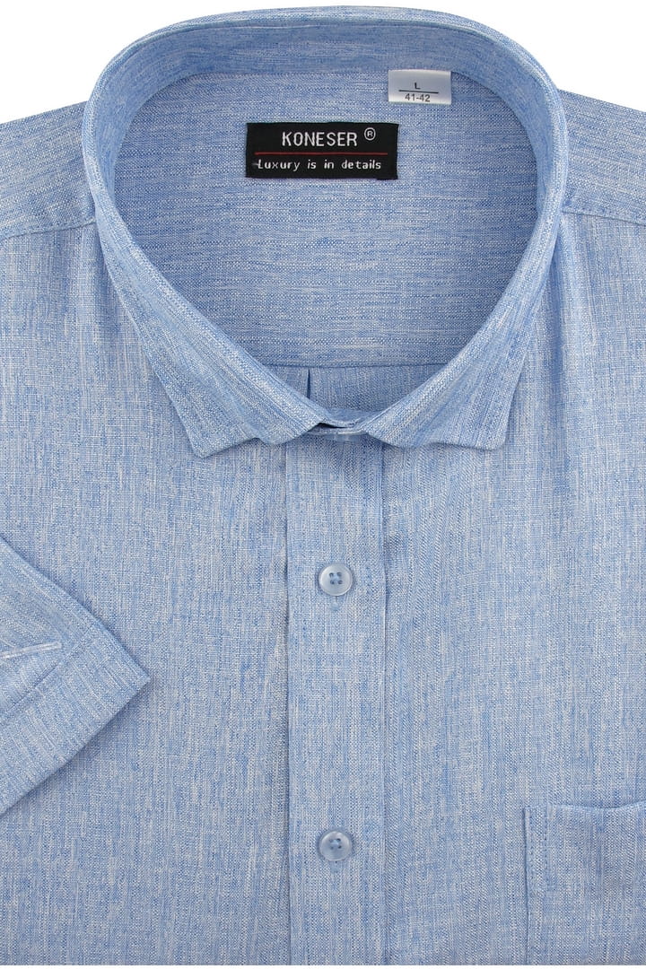 Lniana Duża Koszula Męska Codzienna Casual niebieska z krótkim rękawem Duże rozmiary Koneser P988