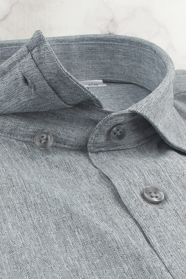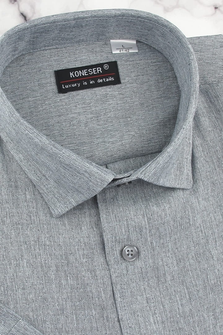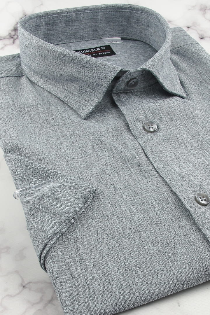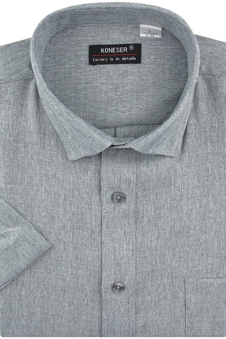 Lniana Duża Koszula Męska Codzienna Casual szara z krótkim rękawem Duże rozmiary Koneser P986
