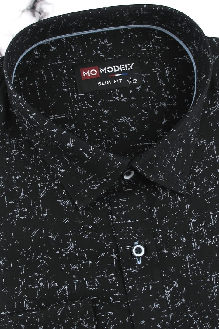 Lniana Koszula Męska Codzienna Casual czarna we wzorki z długim rękawem w kroju SLIM FIT Modely H844