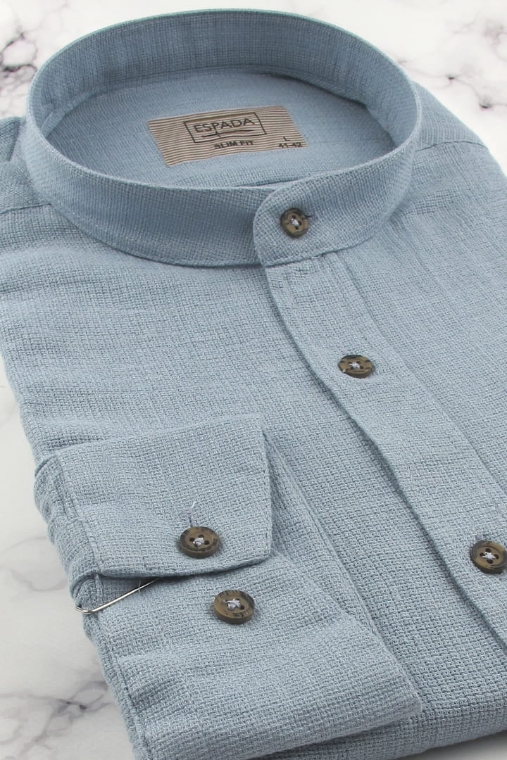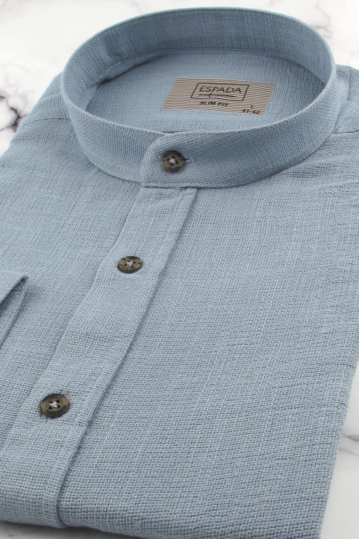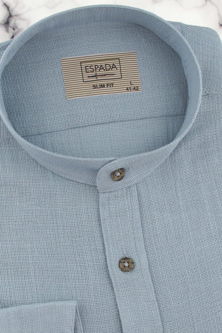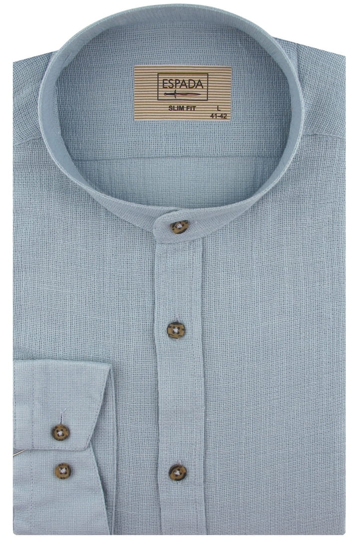 Lniana Koszula Męska Codzienna Casual ze stójką gładka szaro-niebieska z długim rękawem w kroju SLIM FIT Espada Men's Wear J332